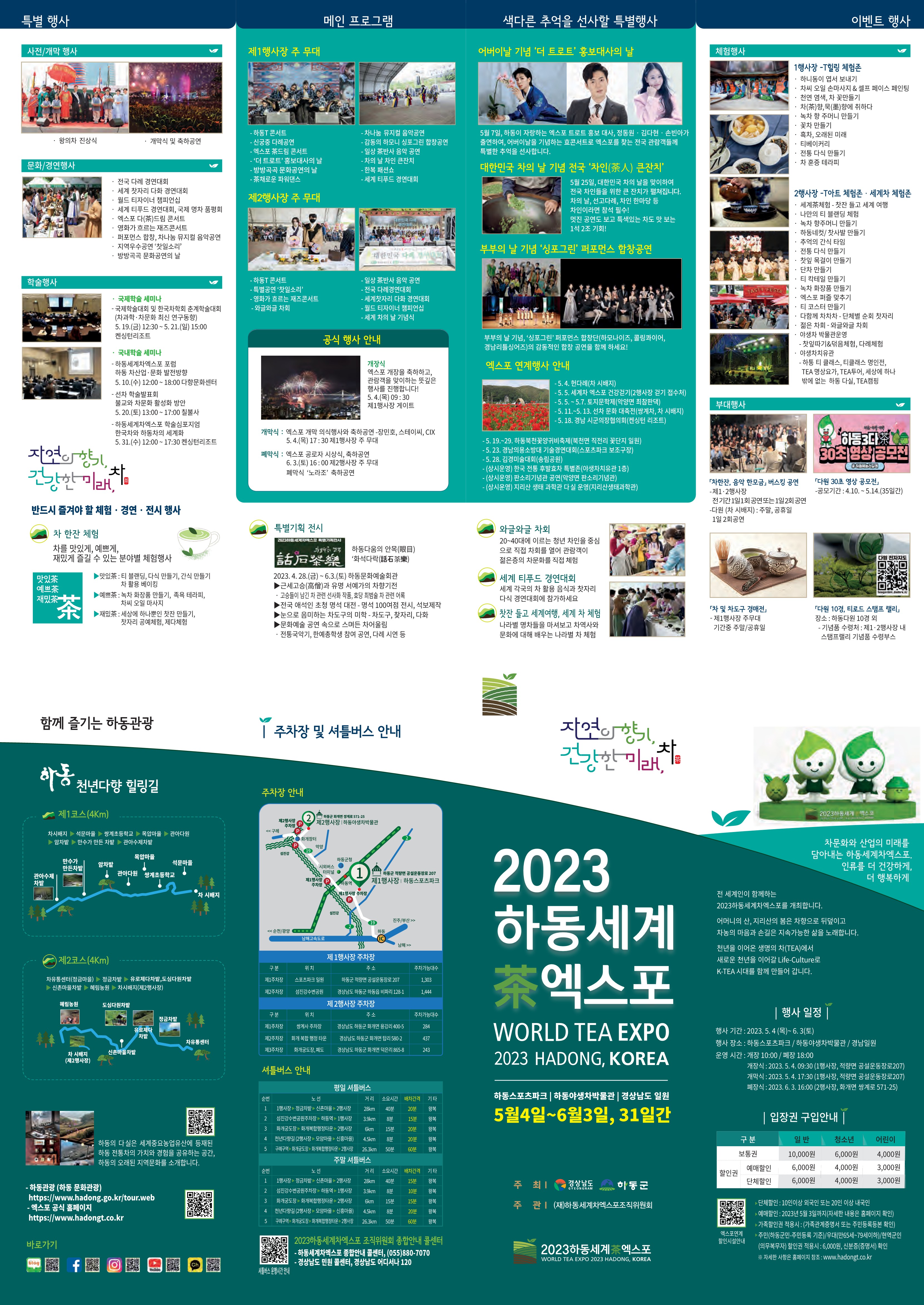아래에 첨부한 사진은 2023 하동 세계 차 엑스포의 다양한 정보를 담고 있는 리플렛이다.