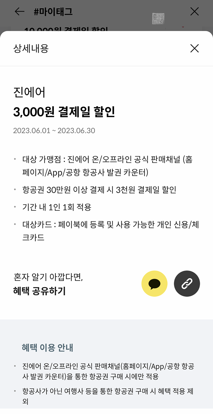 진에어 항공권 할인은 항공권 30만 원 이상 결제 시 3천 원 결제일 할인이기 때문에 사실상 국내 비행기 예약으로 할인을 받기는 어렵다. 일본을 방문하더라도 비행기 값이 왕복으로 30만 원이 채 되지 않는 경우가 많다 보니 조금 멀리 떨어진 해외로 여행을 가거나 친구와 가족들의 비행기 값을 함께 결제해야 할인을 받을 수 있다고 생각해야 한다.
