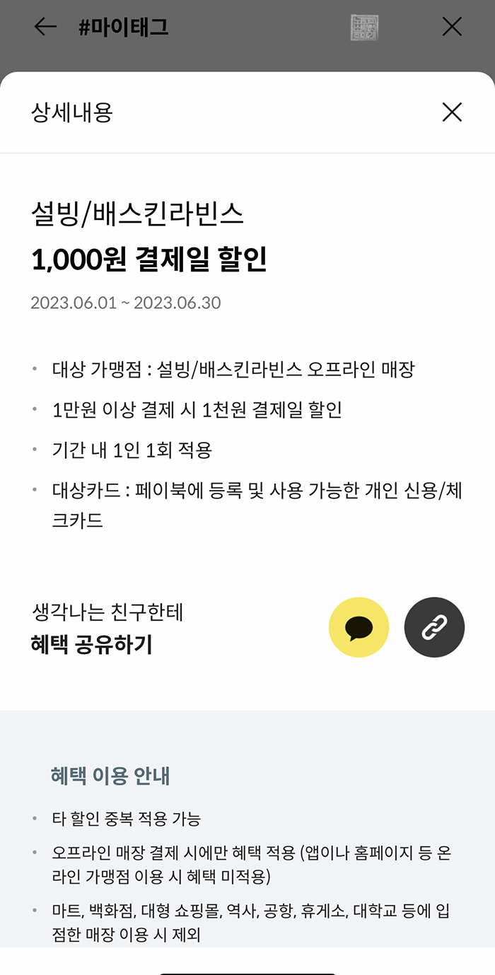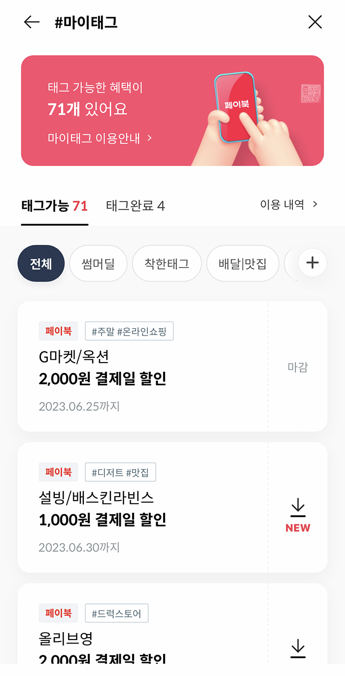 만약 이번에 아파트 관리비와 도시가스 등의 자동납부를 신규로 신청하는 사람들은 1천 원 캐시백 할인을 받을 수 있는 혜택도 있다. 오는 6월을 맞아 새롭게 공개된 페이북 마이태그 새로운 할인 혜택 중 눈에 띄었던 건 본격적인 여름을 맞아 이용할 수 있는 설빙/배스킨라빈스 1천 원 결제일 할인이다. 역시 여름은 설빙과 배라라고 할까?