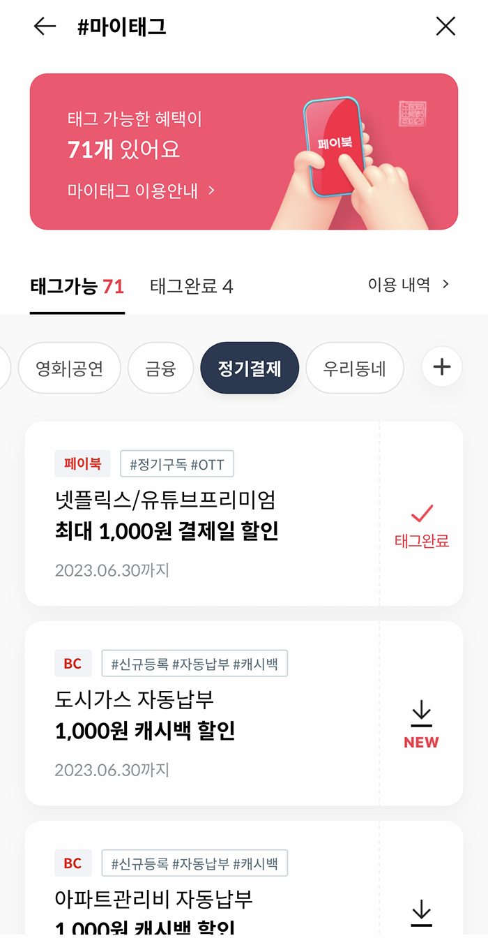 오늘부터 6월이 시작되면서 BC 카드 페이북 어플을 이용하는 사람들은 다양한 마이태그 할인을 재차 신청할 수 있게 되었다. 나는 이번 6월 1일도 #정기구독 #OTT 서비스인 넷플릭스와 유튜브 프리미엄 최대 1천 원 결제일 할인 마이태그를 비롯해서 평일 아침 오전 8시부터 11시까지 CU 편의점 1천 원 결제일 할인 등의 혜택을 챙겼다.