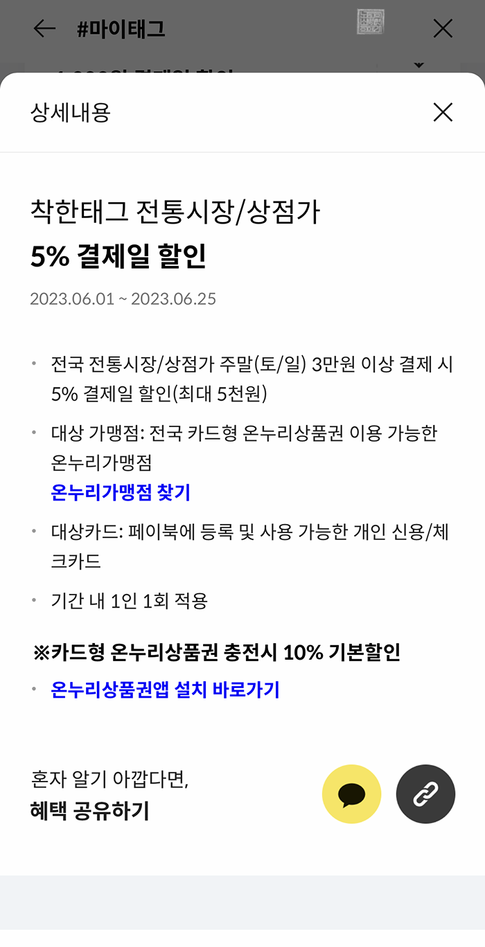 착한태그 전통시장 5% 결제일 할인은 전국 전통시장 상점가에서 주말(토/일) 3만 원 이상 결제를 한다면 결제일에 5% 할인(최대 5천 원)을 받을 수 있는 할인 혜택이다. 대상 가맹점은 전국 카드형 온누리 상품권 이용 가능한 온누리 가맹점으로, 아마 전통시장에 자리 잡고 있는 여러 상점가들에서는 예외적인 경우가 아니라면 혜택을 받을 수 있다.