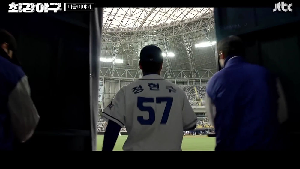 그 정도로 <최강야구 45회>에서 그려지는 몬스터즈와 성균관대학교 두 팀의 예고편은 어마어마했다. 44회 마지막 엔딩 장면을 통해 선발로 나설 확률이 높을 것 같았던 대학교 투수 정현수가 정말 성균관대학교 전에서 선발로 나서게 되는 듯했는데, 그가 그라운드로 입장하는 첫 모습은 마치 영화 속의 한 장면을 보는 듯한 연출이었다.