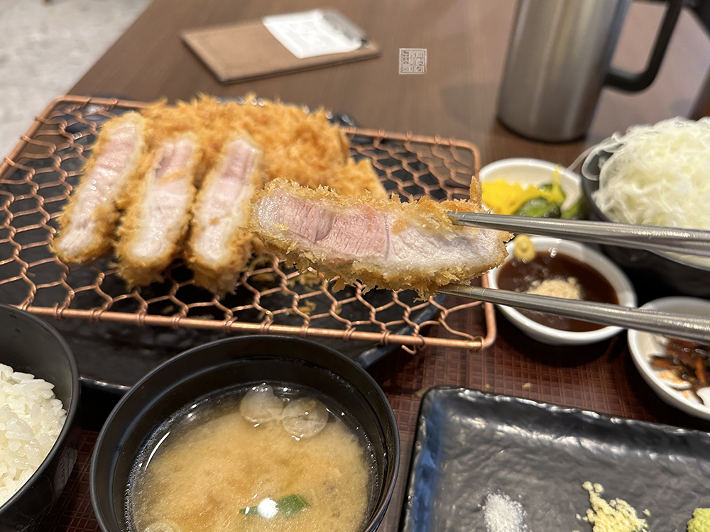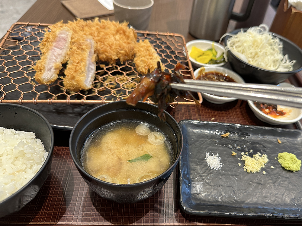지방에 먹을 수 있는 특 등심카츠와 크게 다른 점은 없었지만, 한눈에 보더라도 돈가스가 굉장히 잘 튀겨졌을 뿐만 아니라 음식들이 모두 깔끔하다는 것을 알 수 있었다. 곧바로 돈가스를 젓가락으로 먹고 싶은 욕구를 참으면서 필요한 사지노가 영상을 찍고 한 조각을 먹었는데… 와…, 이거 진짜 17000원이 아깝지 않을 정도로 맛있었다.
