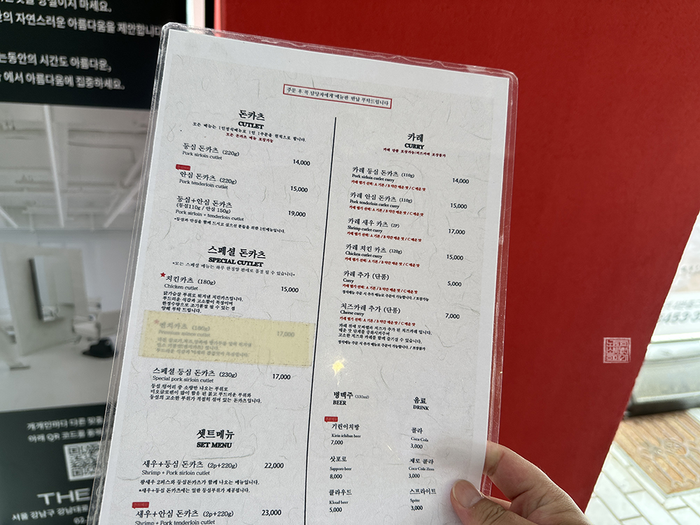 그래서 나도 가격이 비싸기는 해도 등심 돈카츠(14,000원)가 아니라 스페셜 등심 돈카츠 (17,000원)을 주문하기로 했다. 서울 물가 수준에 깜짝 놀라기도 했지만, 내가 거주하는 김해에서도 맛있는 '돈카츠'라고 말할 수 있는 돈가스는 14,000원 정도가 하기 때문에 그렇게 차이가 없어 서울까지 온 김에 이왕이면 맛있는 걸 먹고자 했다.