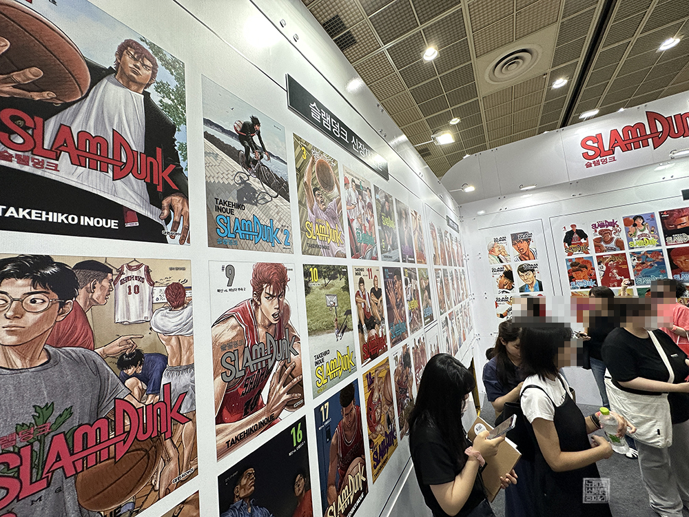 왼쪽으로 먼저 발걸음을 옮기면 조금 떨어진 곳에서 사람들이 북적거리는 부스를 발견할 수 있다. 바로 2023 서울국제도서전에서 슬램덩크 단독관을 운영하고 있는 대원씨아이 부스로, 대원씨아이는 이번에 여러 작품을 동시에 전시하는 것이 아니라 애니메이션 극장판을 통해 사람들의 높은 관심을 받은 <슬램덩크> 하나에 집중을 했었다.