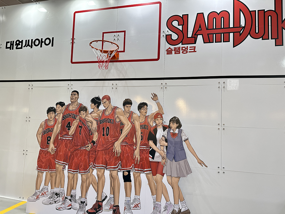 슬램덩크 단독관에서는 오리지널 만화 <슬램덩크>의 표지를 인쇄해 붙여 놓은 벽면만 아니라 <슬램덩크 신장 재편판> 표지와 함께 표지에 사용되었던 각 선수들의 모습을 감상할 수 있다. 그리고 부스 뒤에는 바로 위에서 볼 수 있는 사진 그대로 북산의 모든 멤버들이 함께 있는 등신대 일러스트와 농구 골대가 포토존으로 되어 있다.