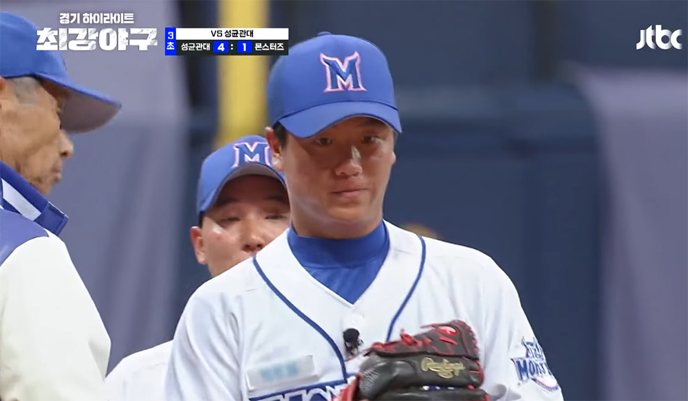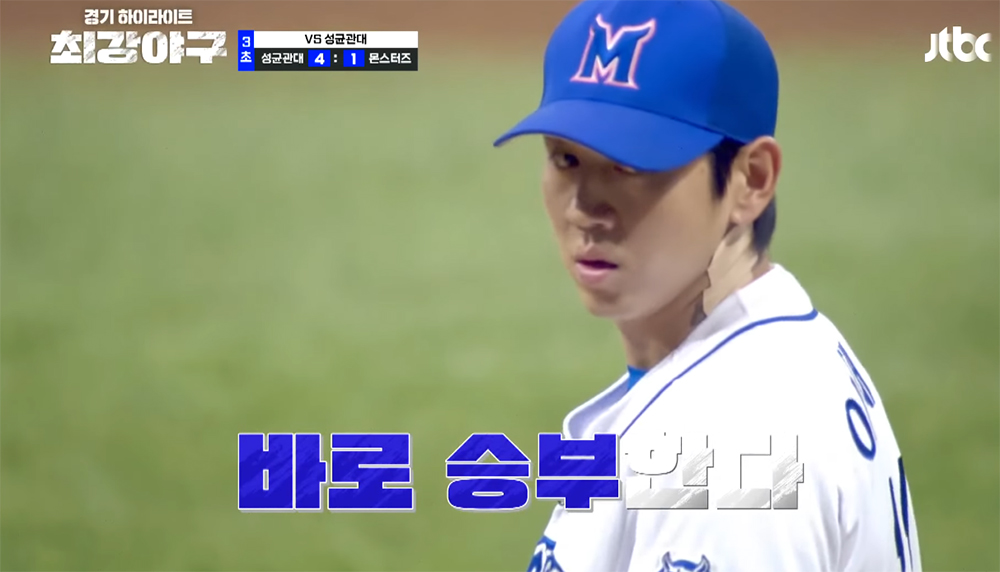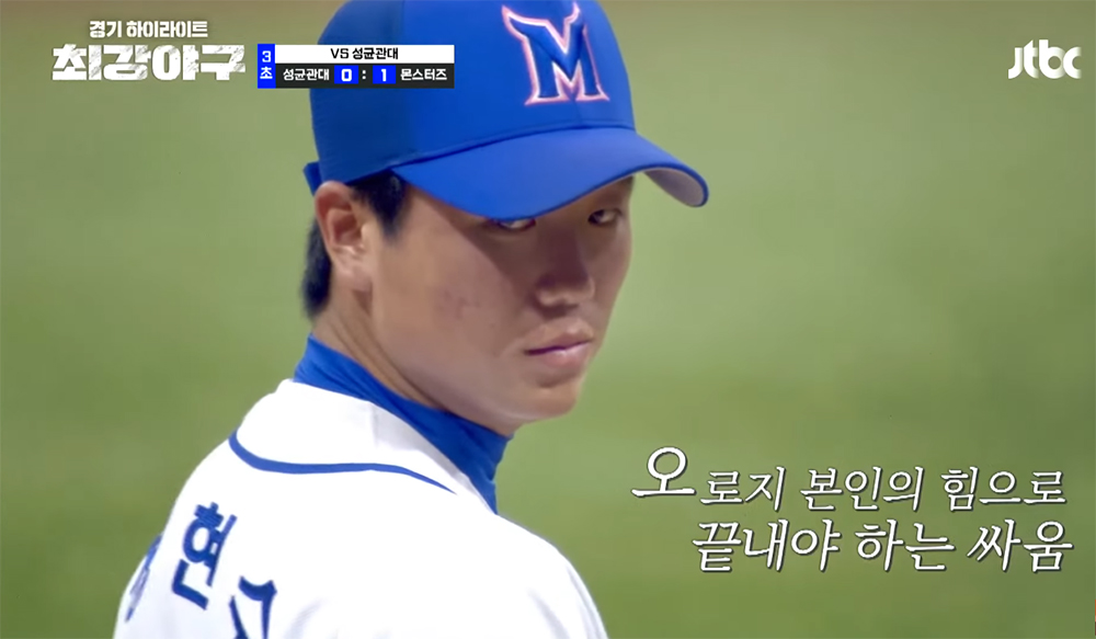 지난 <최강야구 45회>에서도 그러한 연출은 대단히 뛰어났다. 성균관대학교와 펼치는 시합에서 선발 투수로 나서는 정현수가 입장하는 장면부터 이미 프로야구와 급이 다른 연출을 보여주었는데, 정현수는 마운드에서 최대 145km의 빠른 공을 던지면서 2회까지 8타자를 상대하며 5삼진을 잡을 정도로 안정적인 피칭을 보여주었다.