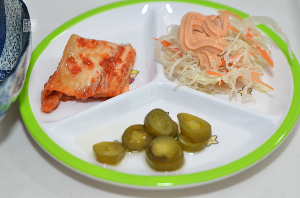 그리고 <마츠다 부장님의 함박 스테이크>도 치즈 함박 스테이크 제품과 별 다른 일 없이 맛있게 먹을 수 있었다. 다른 반찬 없어도 밥을 맛있게 먹을 수 있지만, 그래도 기분 삼아 집에서 반찬으로 먹는 김치와 함께 할라피뇨 슬라이스, 그리고 다이어트를 위해 아침마다 먹고 있는 양배추 샐러드를 곁들이면 완벽한 한 끼가 완성되었다.