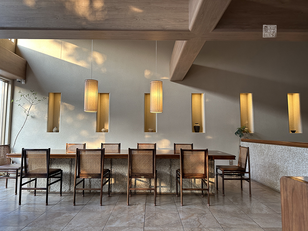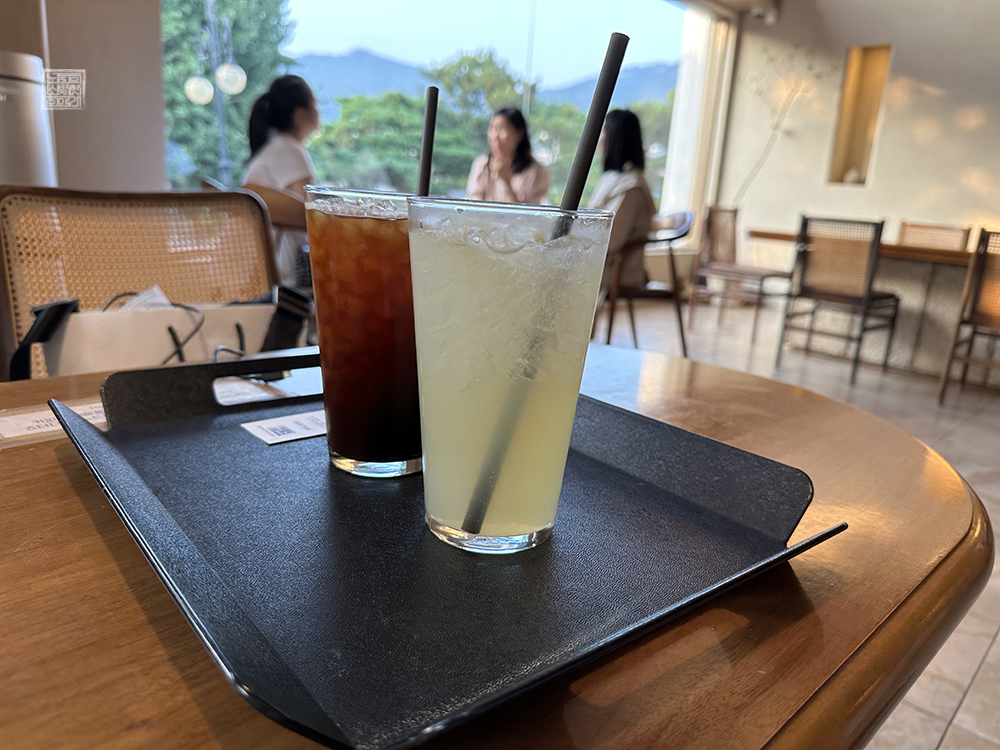 당시 나와 지인이 방문했던 시간이 슬슬 해가 지기 시작하는 저녁 무렵이다 보니 처음에는 따뜻한 느낌으로 햇빛이 들어와서 좋았고, 해가 점점 지기 시작할 때는 완전히 어두워지기 전에 만들어지는 분위기가 무척 좋았다. 괜히 이곳이 김해 MZ 세대들 사이에서 풍경 맛집이자 셀카 맛집으로 유명한 카페가 아니라는 것을 알 수 있었다.