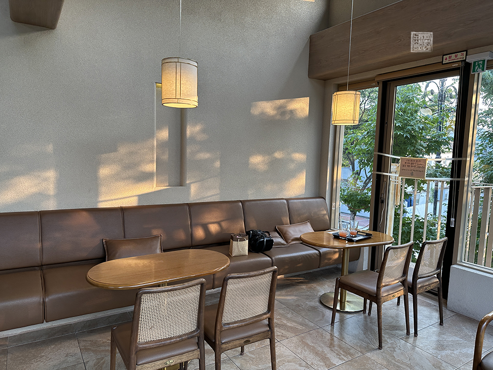 당시 나와 지인이 방문했던 시간이 슬슬 해가 지기 시작하는 저녁 무렵이다 보니 처음에는 따뜻한 느낌으로 햇빛이 들어와서 좋았고, 해가 점점 지기 시작할 때는 완전히 어두워지기 전에 만들어지는 분위기가 무척 좋았다. 괜히 이곳이 김해 MZ 세대들 사이에서 풍경 맛집이자 셀카 맛집으로 유명한 카페가 아니라는 것을 알 수 있었다.
