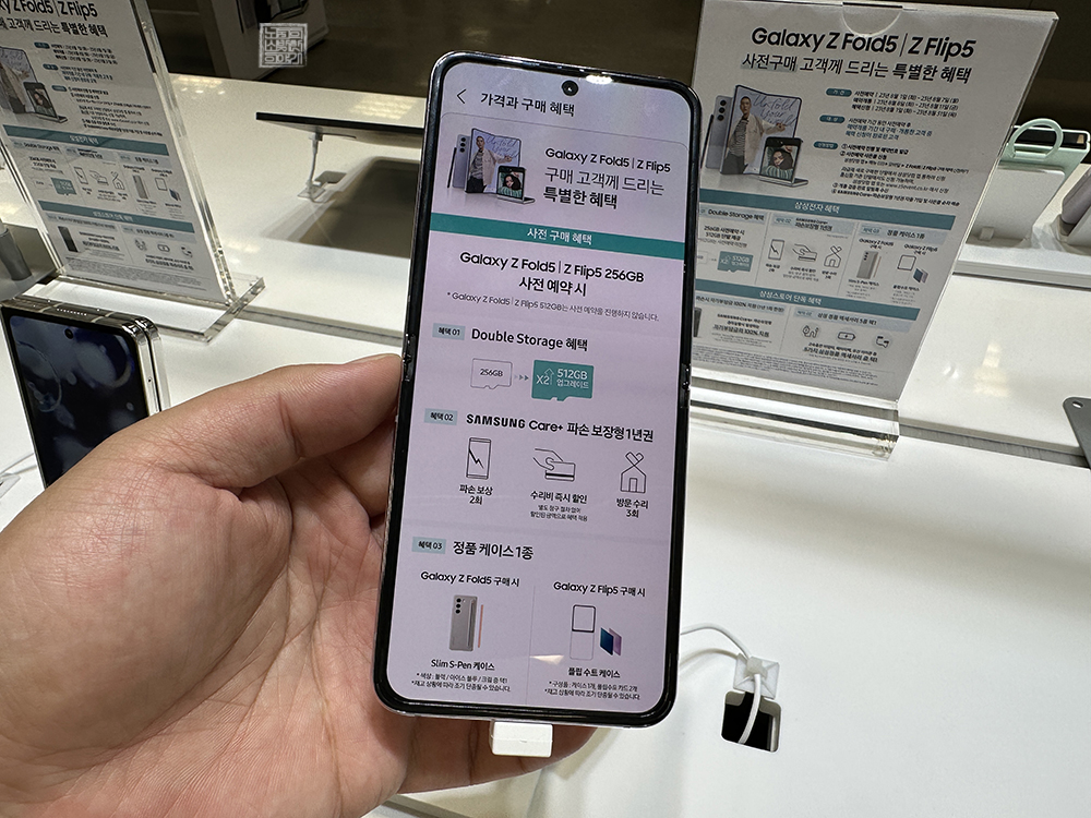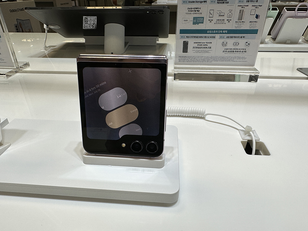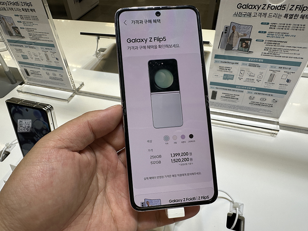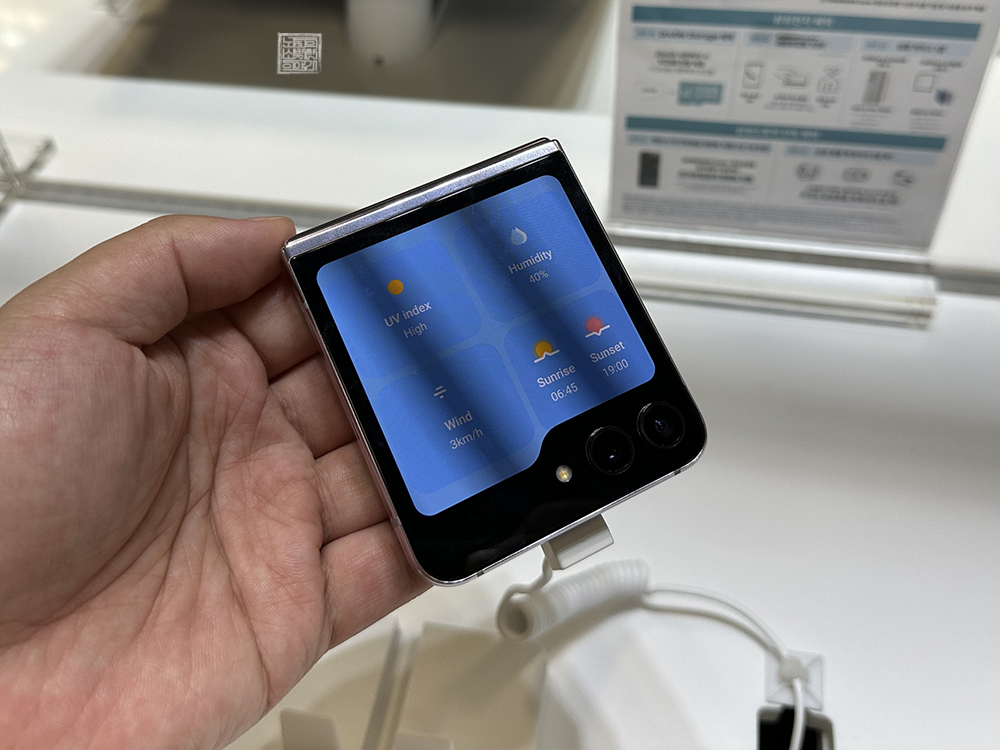 실제로 체험 매장에서 갤럭시 Z 플립5를 만져 보았을 때 완전히 폴더로 접히는 외관 디자인에 웃음이 새어 나올 수밖에 없었다. 하지만 여전히 갤럭시 Z 플립5 내부 화면을 본다면 깔끔하게 화면이 뜨기는 해도 접히는 부분에 굴곡이 있는 것을 볼 수 있었다. 이 부분은 갤럭시 Z 플립 시리즈를 이용하다 보면 익숙해진다고 해도 살짝 아쉬웠다.