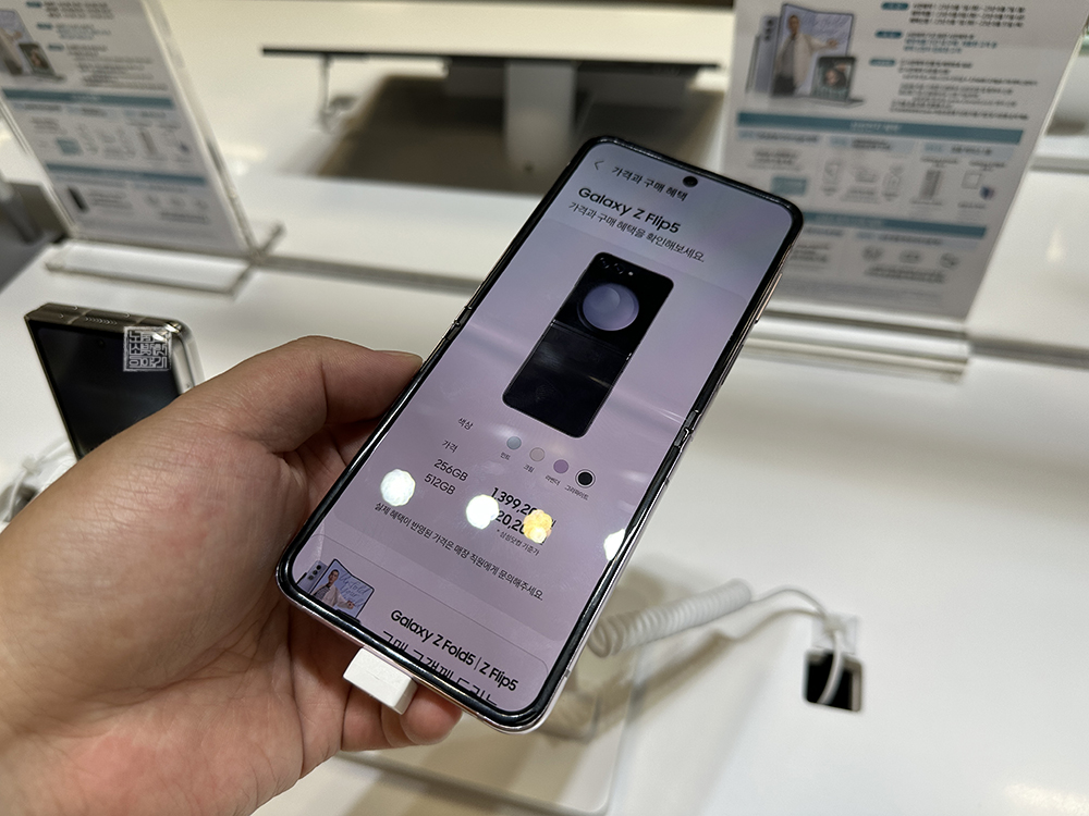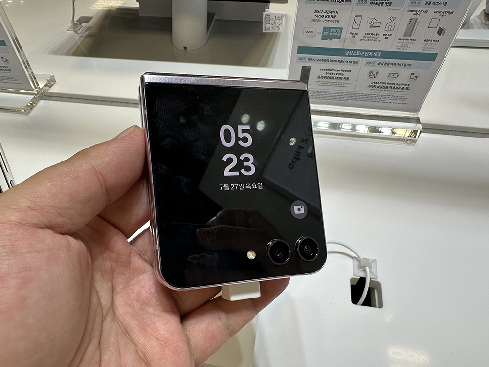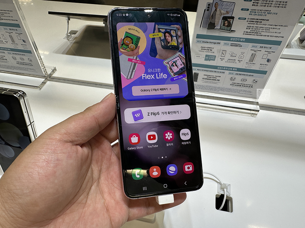 실제로 체험 매장에서 갤럭시 Z 플립5를 만져 보았을 때 완전히 폴더로 접히는 외관 디자인에 웃음이 새어 나올 수밖에 없었다. 하지만 여전히 갤럭시 Z 플립5 내부 화면을 본다면 깔끔하게 화면이 뜨기는 해도 접히는 부분에 굴곡이 있는 것을 볼 수 있었다. 이 부분은 갤럭시 Z 플립 시리즈를 이용하다 보면 익숙해진다고 해도 살짝 아쉬웠다.