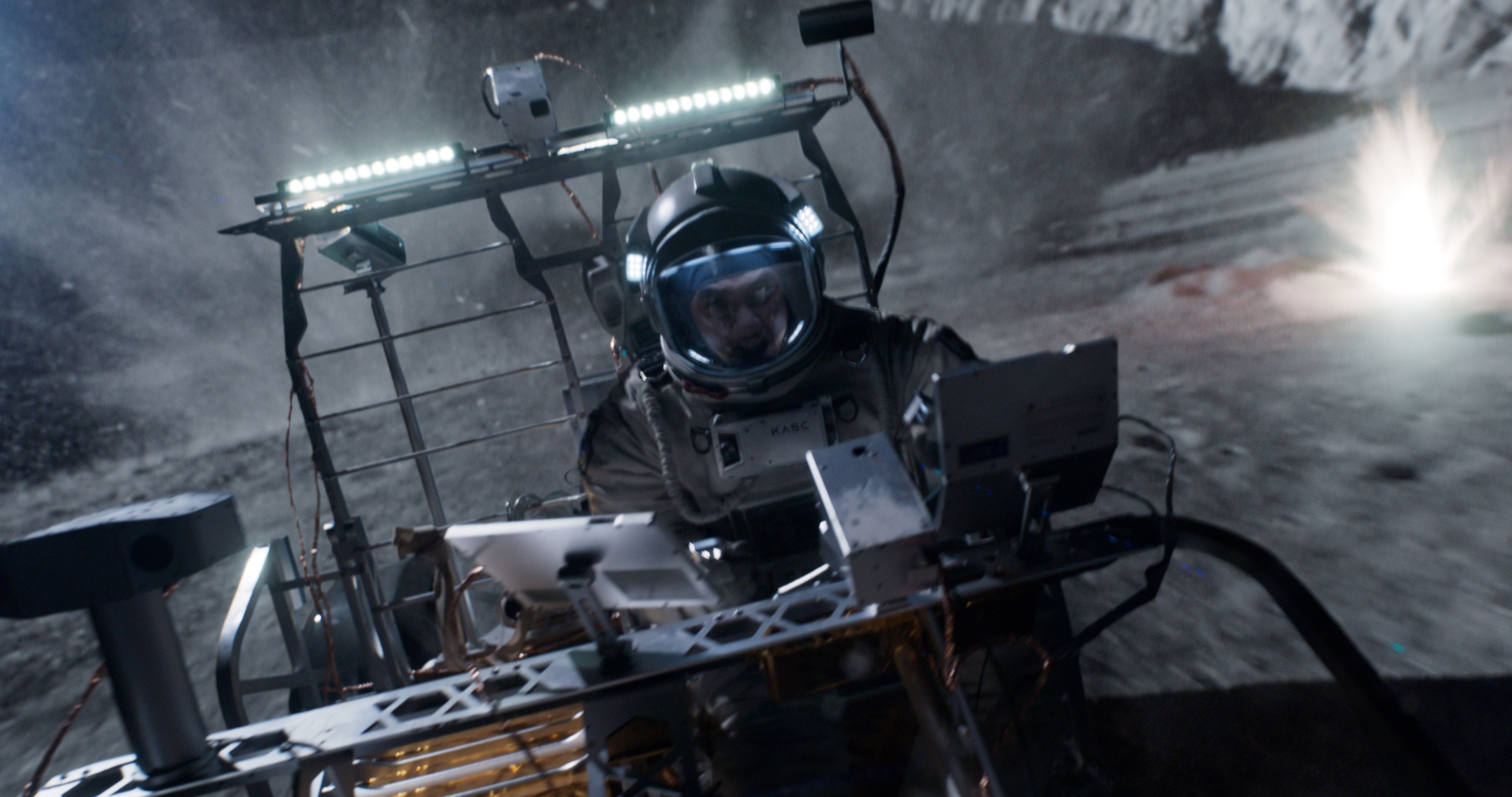 영화 <더 문>은 우리호를 타고 달로 향하던 우주인 세 명이 태양풍의 영향으로 기체에 손상을 입은 장면으로 이야기의 막을 올린다. 이때 김래원과 이이경 두 사람은 초기에 바로 사고로 탈락을 해버리면서 도경수 혼자 살아남게 되는데, 엎친 데 덮친 격으로 시스템 문제로 도경수는 귀항할 것인지 달에 착륙할 것인지 선택을 해야만 했다.