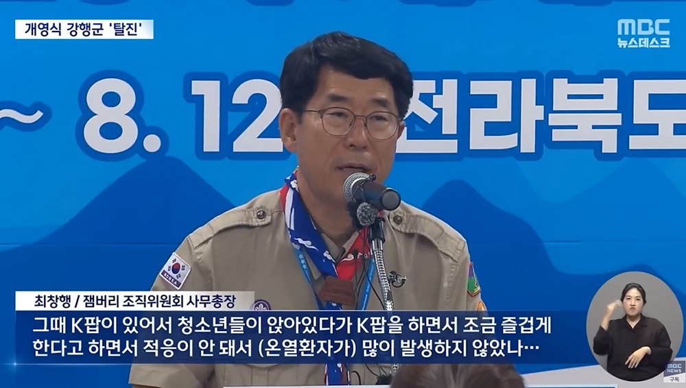 폭염으로 인해 사람들이 쓰러지는 상황 속에서도 윤석렬 대통령 내외가 참여한다는 이유로 세계 각국의 스카우트 멤버들을 땡볕에 방치하고, 사람들이 쓰러진 이유에 대해서 "K-POP 때문에 에너지를 지니치게 소비한 탓이라고 생각합니다."라며 황당한 답변을 내놓으며 질타를 받았다. 그 머리에는 뇌가 아니라 라면사리가 들어 있는 걸까?