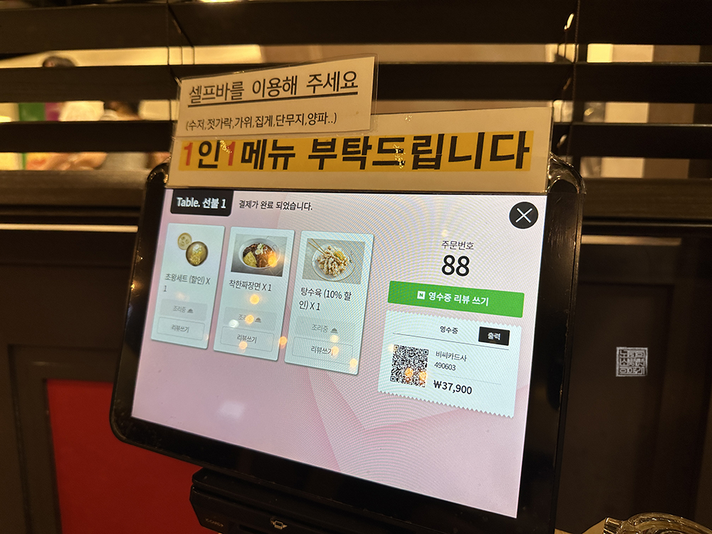 아무튼, 그렇게 자리에 배치되어 있는 태블릿 PC를 통해 주문과 결제를 모두 마친 이후 주문한 짜장면과 탕수육을 비롯한 여러 요리가 나오기를 기다렸다. 당시 교동짬뽕 김해 이마트점은 점심 시간이다 보니 사람들이 발 디딜 틈 없이 가게를 꽉 채우고 있었는데, 점심시간을 맞아 매장에 들어오는 데에도 적지 않은 시간이 걸린 맛집이었다.
