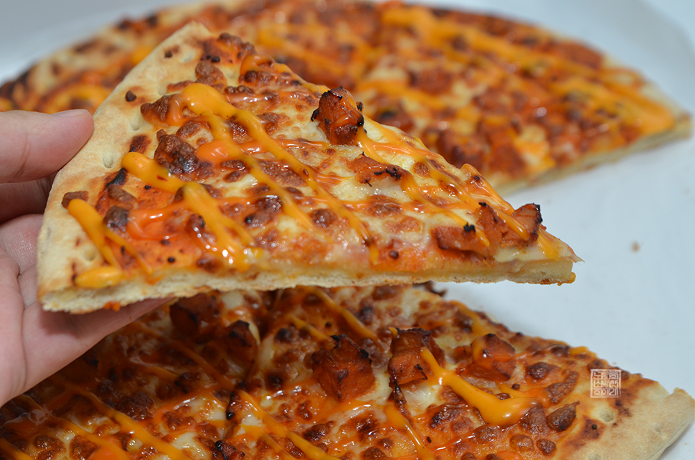 위 사진에서 볼 수 있는 핫치킨&치즈 피자는 가격이 8980원에 판매되는 피자로, 오늘날 우리가 저렴한 피자 프랜차이즈 지점에서 구매를 해도 가격이 1만 원이 넘어가는 걸 생각한다면 상당히 가성비를 갖추고 있다고 말할 수 있다. 하지만 가격이 저렴한 만큼 피자의 퀄리티는 다소 떨어지는 편이지만… 그렇다고 맛이 없는 건 아니다.