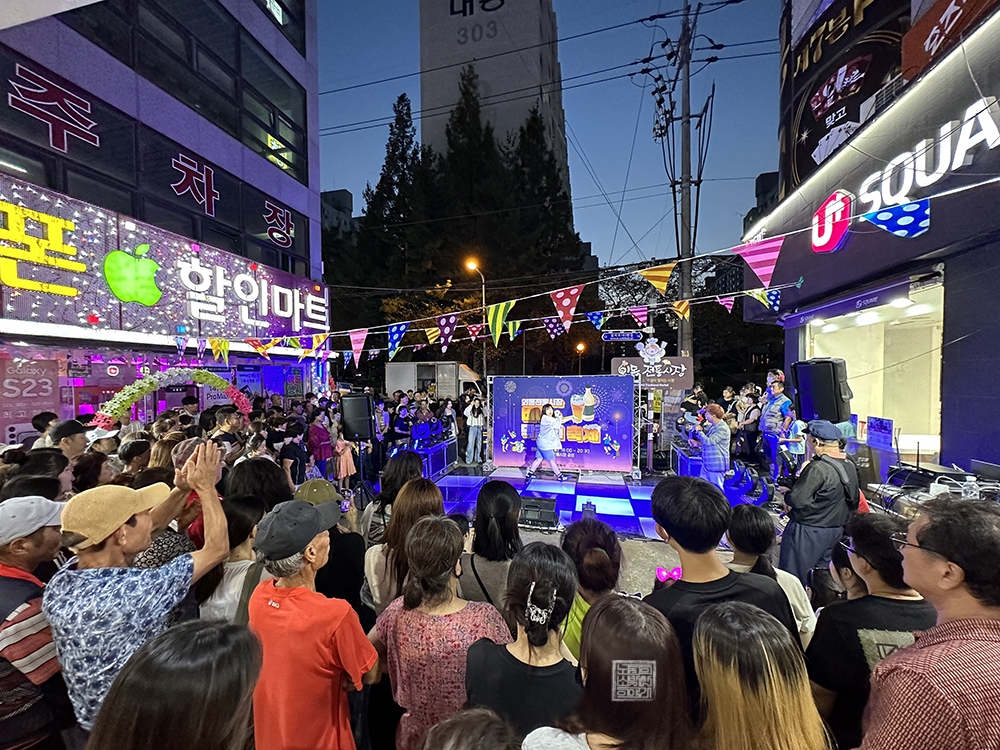 맥주와 막걸리 등을 무료로 받을 수 있는 부스와 반대되는 쪽에 있는 특설 무대에서는 인디 밴드와 댄스팀 등 여러 무대를 구경할 수 있었다. 이곳에서 인디 밴드의 시작 공연이 끝난 이후 외동 시장 상인회 회장님의 인사와 함께 도의원 등의 관계자 분이 짧은 인사말을 하기도 했는데, 외동 시장에서 열린 이 축제가 계속될 수 있을지 궁금하다.
