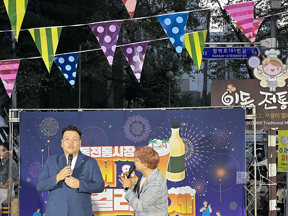 맥주와 막걸리 등을 무료로 받을 수 있는 부스와 반대되는 쪽에 있는 특설 무대에서는 인디 밴드와 댄스팀 등 여러 무대를 구경할 수 있었다. 이곳에서 인디 밴드의 시작 공연이 끝난 이후 외동 시장 상인회 회장님의 인사와 함께 도의원 등의 관계자 분이 짧은 인사말을 하기도 했는데, 외동 시장에서 열린 이 축제가 계속될 수 있을지 궁금하다.