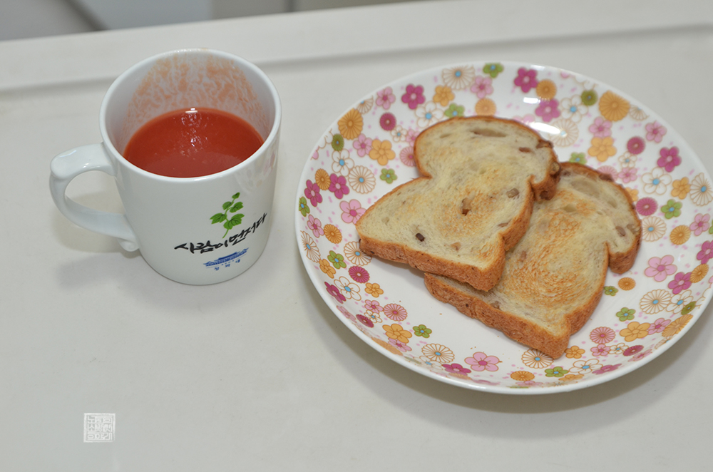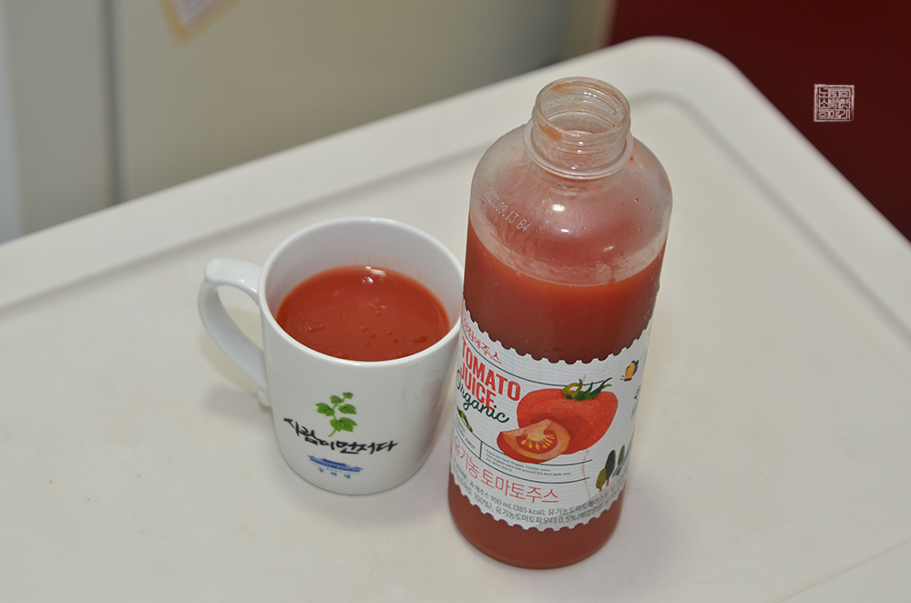 원래 사진을 찍을 때 빵과 함께 토마토 주스를 첫 잔으로 부어서 찍을 생각이었지만, 토마토 주스를 컵에 붓고 나서 식빵이 토스트기에서 익는 걸 기다리는 동안 무심코 주스를 마시고 말았다. 그만큼 아침에주스 유기농 토마토주스는 한번 맛을 본 사람들은 맛있다는 걸 인정할 뿐만 아니라 계속 마시고 싶은 그런 제품이었다.