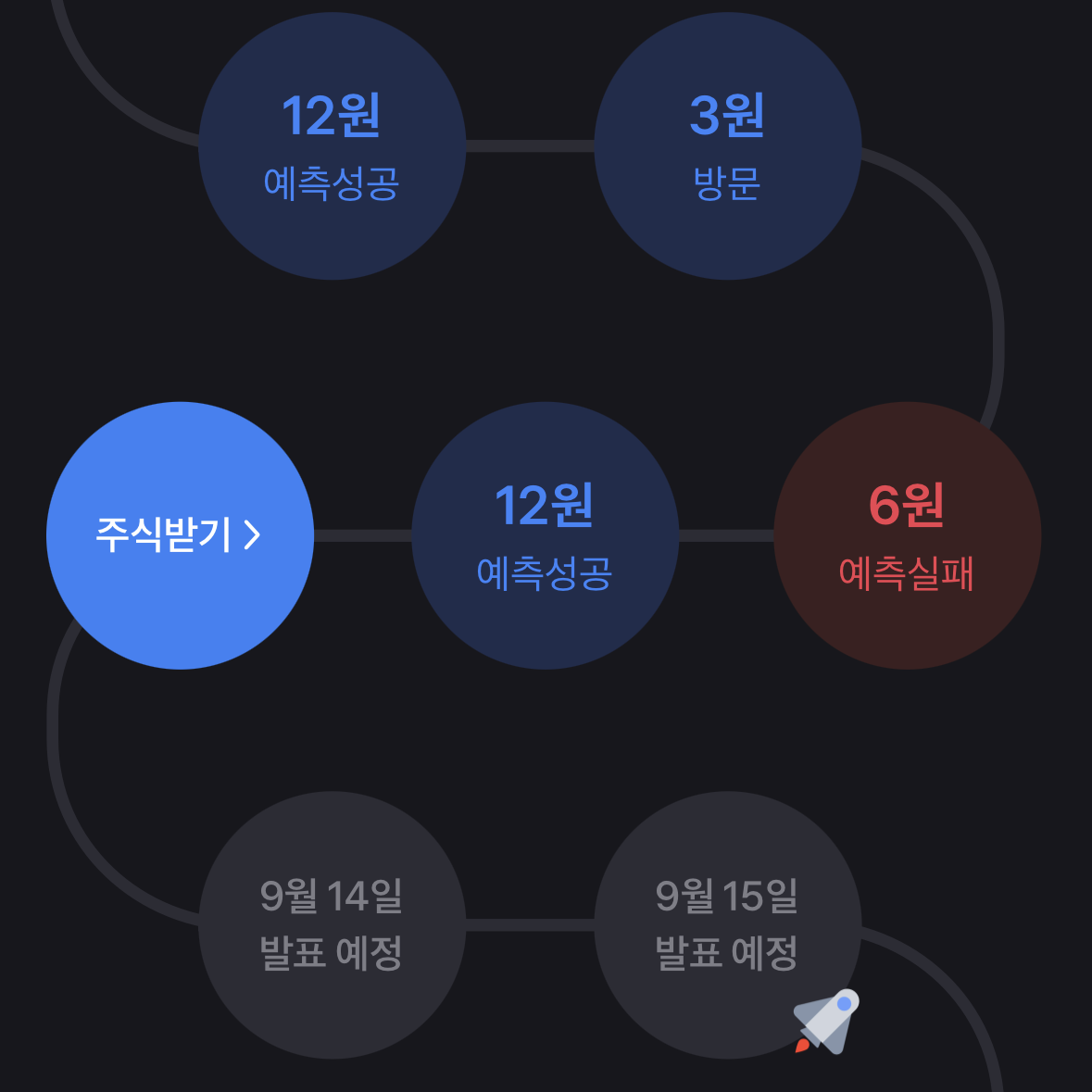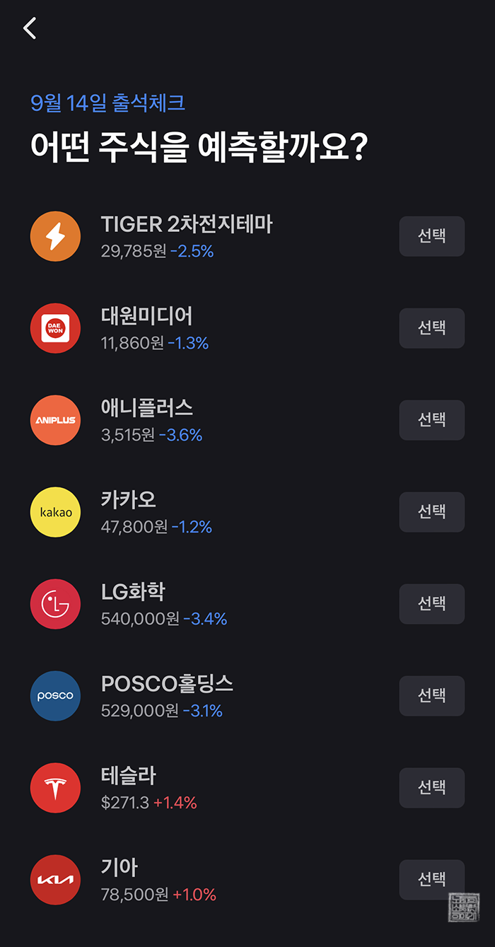 매일 토스의 토스 증권에 접속한다면 '매일 방문할수록 혜택이 커져요. 출석체크하고 주식받기' 버튼을 클릭한다면 출석체크를 할 수 있다. 출석체크를 할 때 그냥 도장을 찍는 게 아니라 특정 주식이 오를지 내릴지 하나를 선택해야 한다. 예측이 성공할 경우 내가 지정한 주식의 12원을 받고, 예측이 실패할 경우에는 6원을 받게 되어 있다.