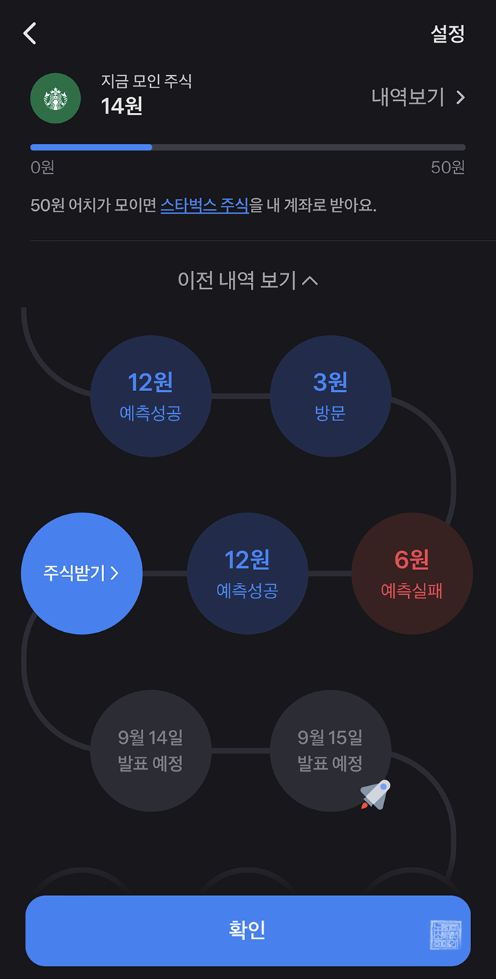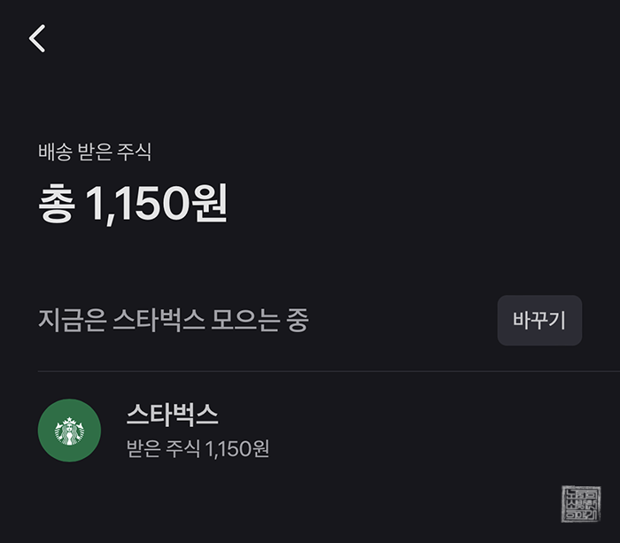 꾸준히 주식이 오를지 내릴지 선택하고 출석체크를 하면서 그동안 스타벅스 주식 1,150원을 받을 수 있었는데… 앞으로 다시 출석체크를 꾸준히 하면서 예측에 실패해도 6원을 받으려면 오랜 시간이 걸릴 것으로 보인다. 누군가에게는 의미 없는 사소한 금액일 수도 있지만, 이렇게 차곡차곡 모아지는 주식을 보면 생각보다 즐거웠다.