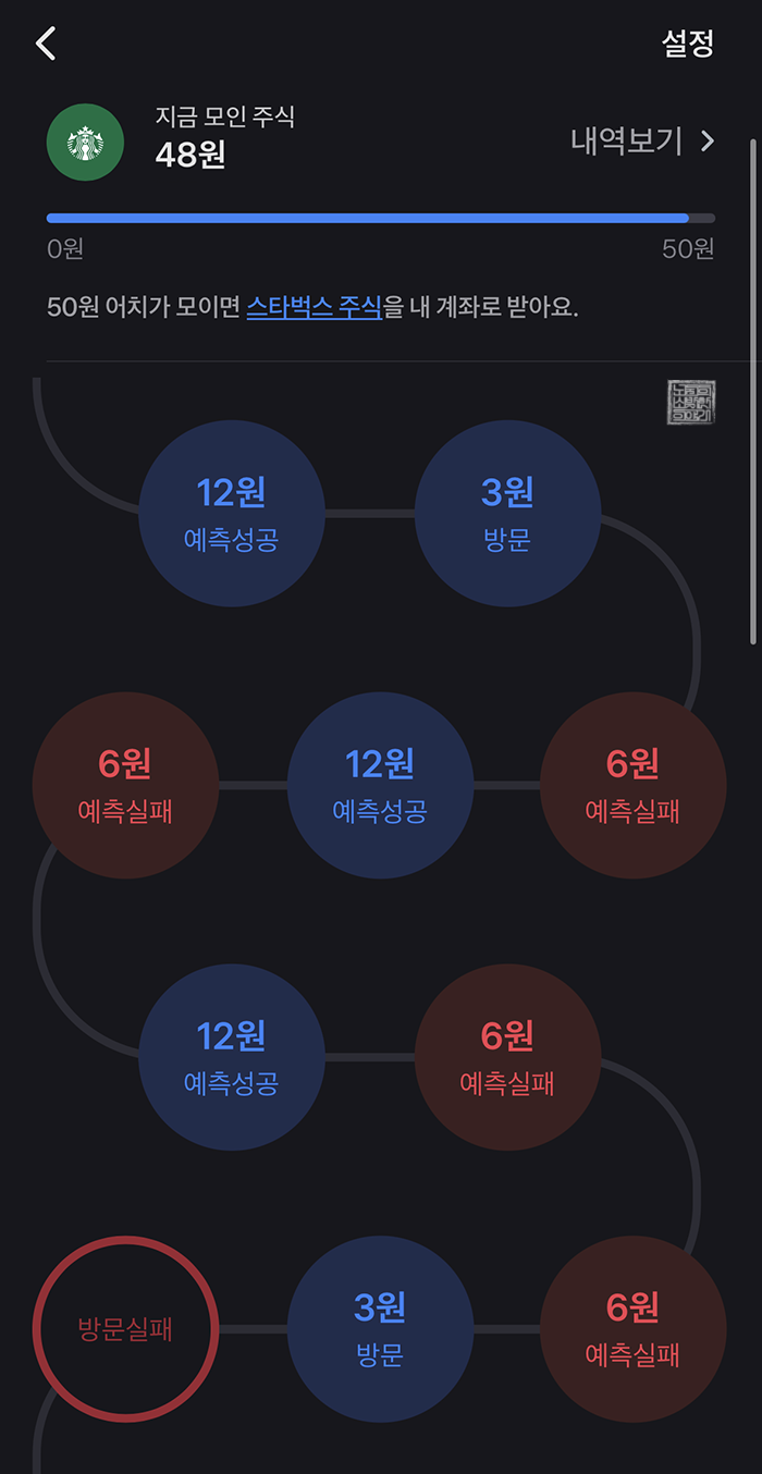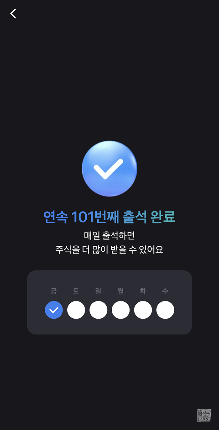 분명히 나는 출석체크를 했다고 생각했는데 하루 출석 체크를 놓치는 바람에 101일 차, 정확히는 104일 차부터 다시 1일 차로 시작이 되면서 출석체크를 통해 받을 수 있는 주식 금액이 줄어들고 말았다. 100일 차가 넘어갔을 때는 예측 실패를 해도 6원의 스타벅스 주식이 적립되었지만, 1일 차로 다시 시작할 때는 고작 1원에 불과했다.