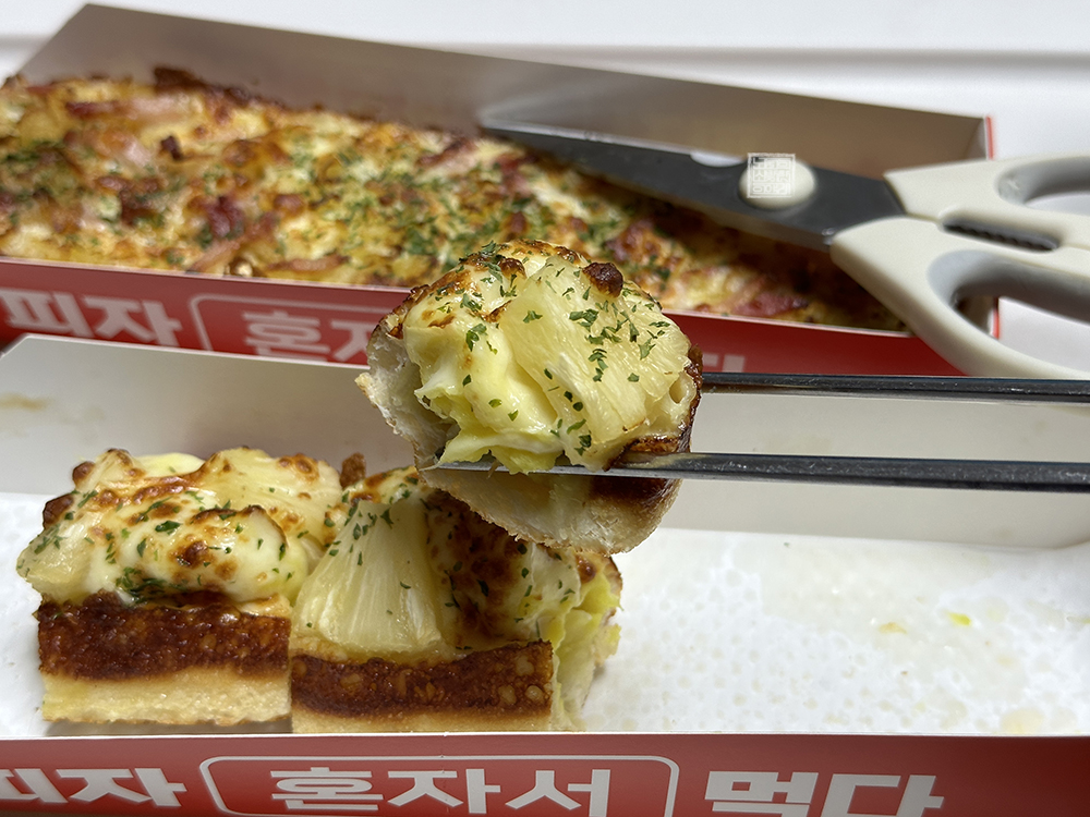 내가 주문한 피자는 하와이언피자와 함께 바삭 포테이토베이컨피자 두 개와 서비스로 받은 마르게리따피자다. 피자의 모습읍 본다면 우리가 알고 있는 피자 전문점에서 먹을 수 있는 동그란 피자가 아니라 직사각형으로 길게 되어 있는 것을 알 수 있다. 이 직사각형의 길이는 25cm이기 때문에 양은 절대 적은 편이 아니라고 생각한다.