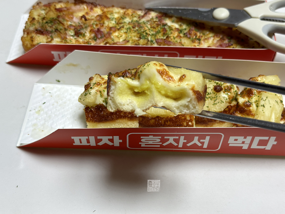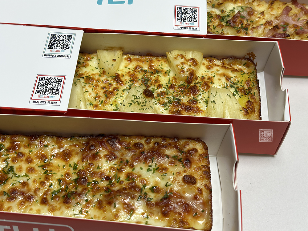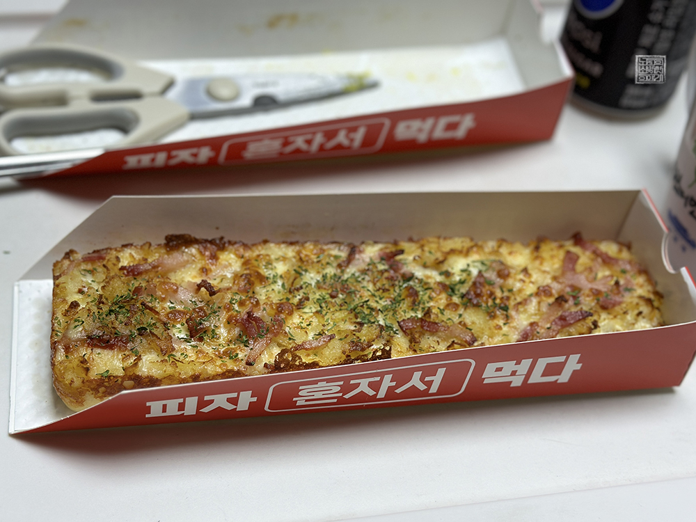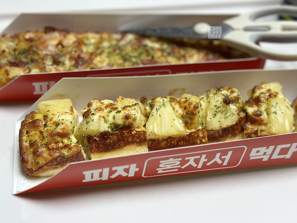 내가 주문한 피자는 하와이언피자와 함께 바삭 포테이토베이컨피자 두 개와 서비스로 받은 마르게리따피자다. 피자의 모습읍 본다면 우리가 알고 있는 피자 전문점에서 먹을 수 있는 동그란 피자가 아니라 직사각형으로 길게 되어 있는 것을 알 수 있다. 이 직사각형의 길이는 25cm이기 때문에 양은 절대 적은 편이 아니라고 생각한다.