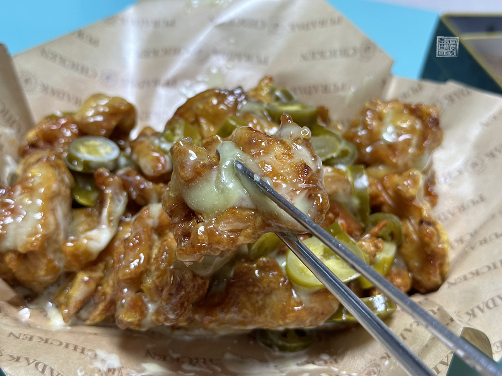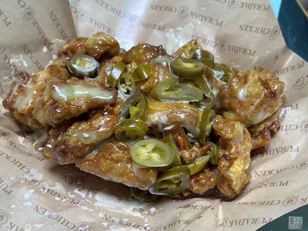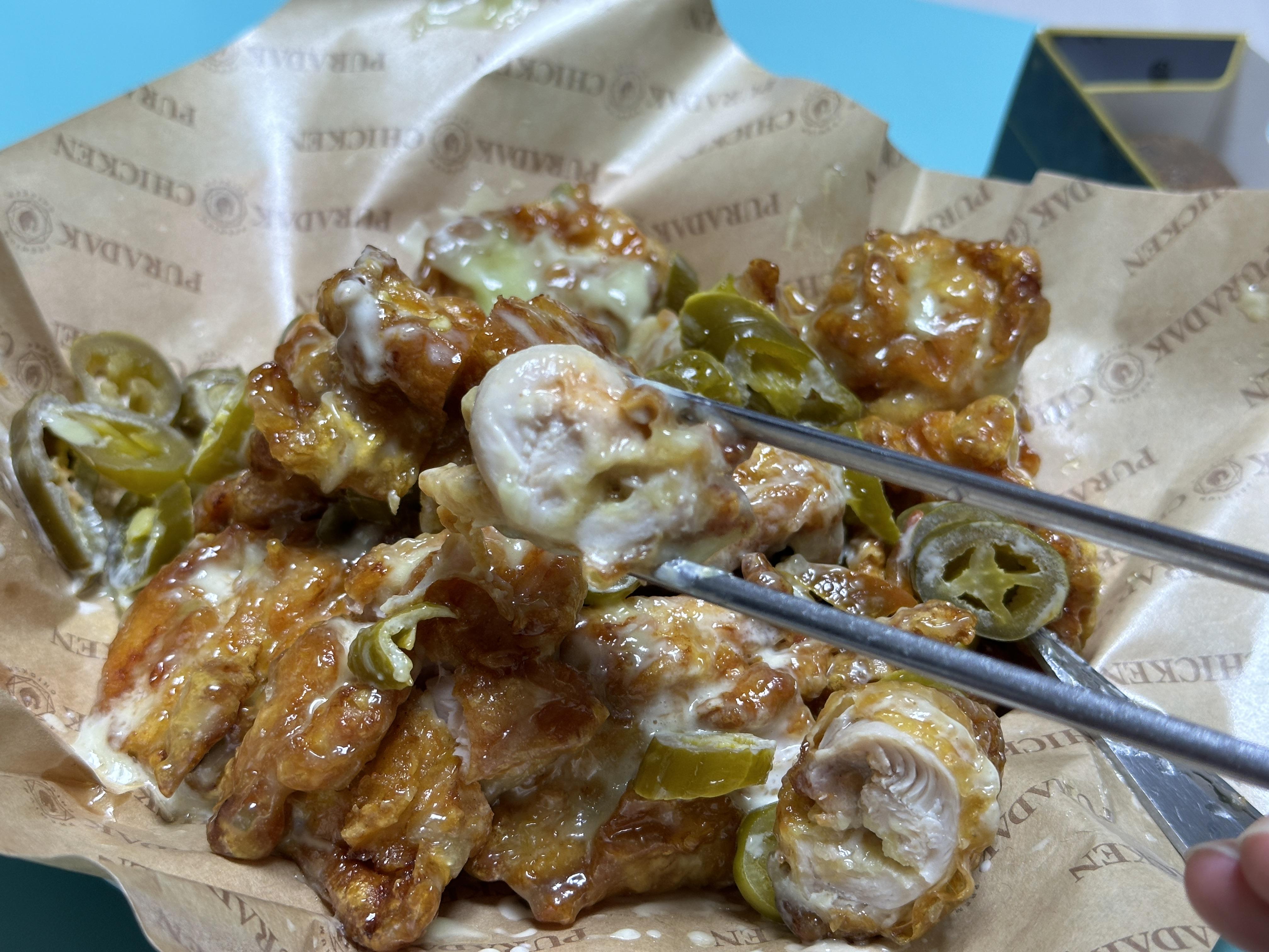 하지만 나는 개인적으로 순살 고추마요 치킨은 꼭 할라피뇨와 함께 먹는 걸 추천하고 싶다. 순살 치킨의 양만큼 할라피뇨가 적절한 비율로 들어가 있기 때문에 가위를 이용해서 치킨을 자른 이후 할라피뇨를 한 개씩 치킨과 함께 먹어도 양이 부족하지 않았다. 여기에 푸라닭 특유의 치킨무와 함께 치즈볼 같은 사이드를 곁들이면 딱 좋았다.