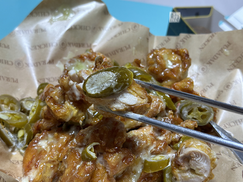 푸라닭의 순살 고추마요 치킨은 그냥 치킨만 먹어도 맛있지만, 위 사진에서 볼 수 있듯이 할라피뇨와 함께 먹으면 정말 끝도 없이 치킨을 먹을 수 있다. 맵단의 구성이 완벽하게 이루어져 있다 보니 먹어도 먹어도 질리지 않는다. 어떻게 말한다면 마약 같은 치킨이라고 말할 수가 있는데, 할라피뇨를 제외하고 먹어도 충분히 음미가 가능하다.