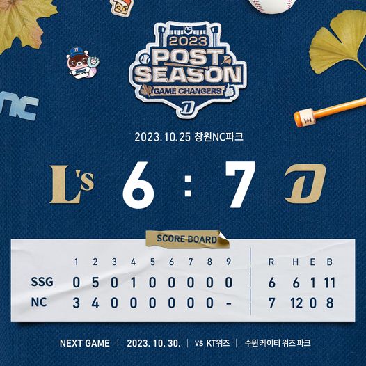 지난 일요일(20일)부터 NC 다이노스와 SSG 랜더스 두 팀이 플레이오프에 진출하기 위한 티켓을 놓고 정면 승부를 벌였다. NC는 시즌 마지막 경기에서 패배하면서 SSG 랜더스에게 3위의 자리를 내주면서 4위로 밀려나 5위 두산과 와일드카드전을 치러야 했는데, 비교적 상대 전적이 불리했던 두산을 상대로 14:9로 승리를 거두었다.