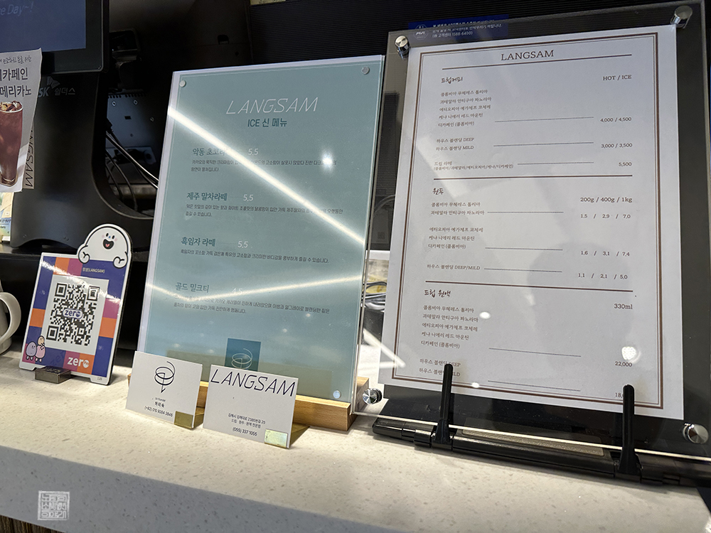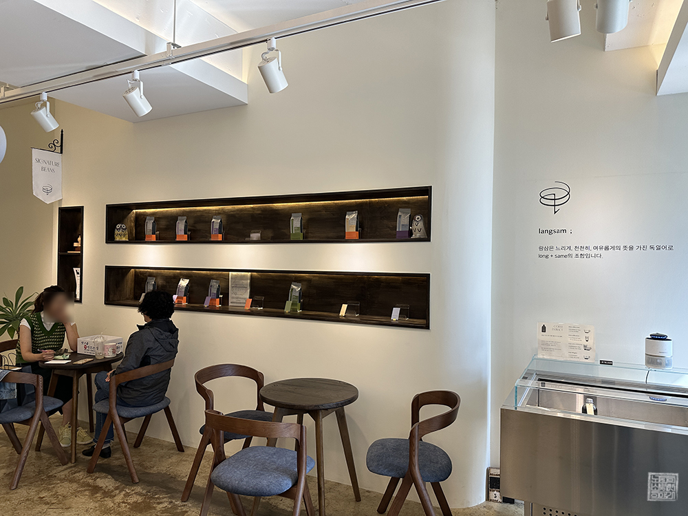 카페 랑삼에 비치된 테이블은 큰 테이블이 아니라 보통 사이즈이거나 혹은 보통 사이즈보다 약간 작은 테이블이 많았다. 카페에서 여러 사람과 함께 조각 케이크와 음료를 마시고자 한다면 테이블 사이즈는 다소 아쉬울 수가 있는데, 카페 랑삼은 조각 케이크와 여러 디저트를 판매하지 않고 오직 원두커피와 아이스 라떼만 판매했다.