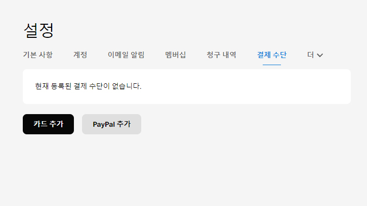 그리고 결제 수단을 선택할 수가 있는데… 결제 수단은 카드와 페이팔 두 개 중 하나를 선택할 수 있다. 내가 구독하거나 결제한 정보는 멤버십과 청구내역을 통해 쉽게 확인할 수 있기 때문에 자칫 잘못 결제했을 경우 빠르게 대처가 가능하다. 하지만 디지털 콘텐츠 플랫폼인 만큼 환불은 사실상 어렵다고 보는 것이 현명하다.
