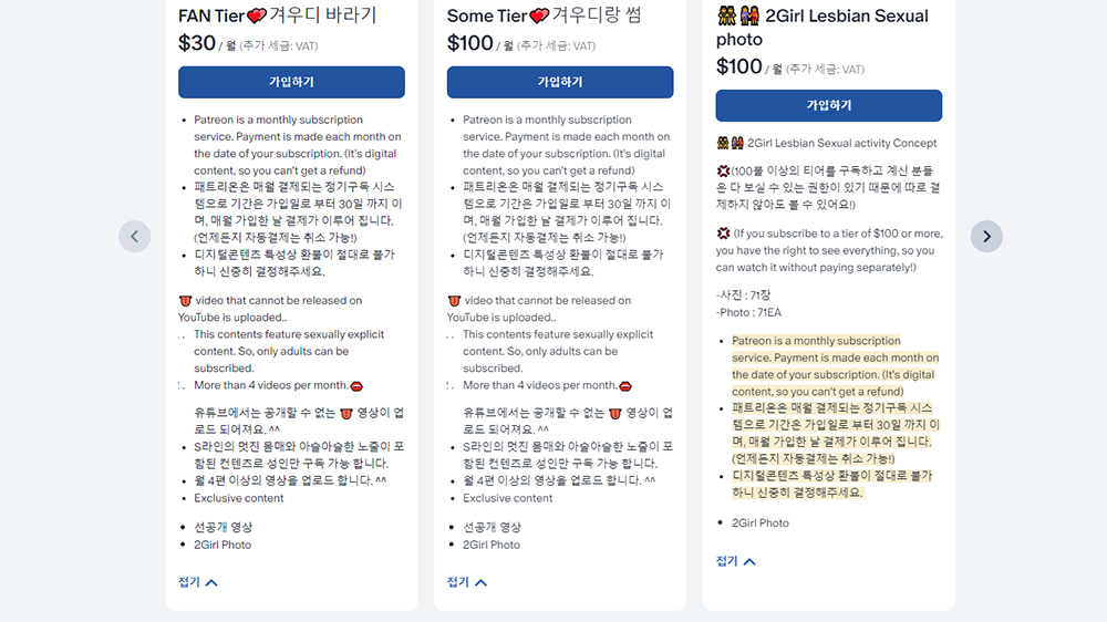 18세 인증을 요구하는 게 아니다 보니 18세 미만이라도 '네, 저는 만 18세 이상입니다.'라는 버튼을 클릭할 수 있는데, 나는 30세가 넘었기에 당당히 '네, 저는 만 18세 이상입니다.'라는 버튼을 눌렀다. 현재 겨우디가 패트리온에서 운영하는 구독 멤버십은 총 6개로, 최저 금액 30$부터 시작해서 최대 500$까지 구독을 할 수 있었다.