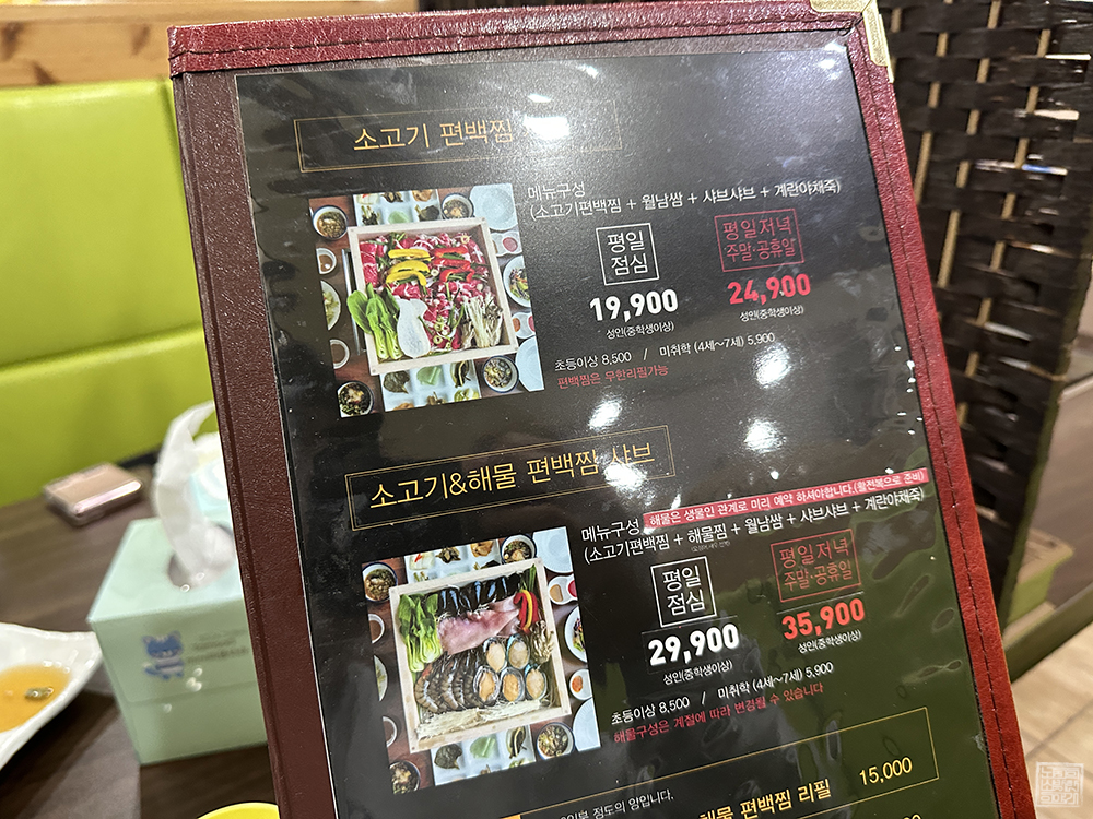 소고기 편백찜 샤브를 기준으로 평일 점심 1인분 19,900원이고, 평일 저녁과 주말·공휴일은 1인분 24,900원에 판매되고 있다. '샤브샤브'가 아니라 김치찌개나 되재국밥이라면 거의 2인분에 해당하는 가격이 1인분 가격이기 때문에 분명히 부담되는 가격이다. 하지만 '편백찜'이 무한 리필이라는 걸 고려한다면 나쁘지 않다고 생각한다.