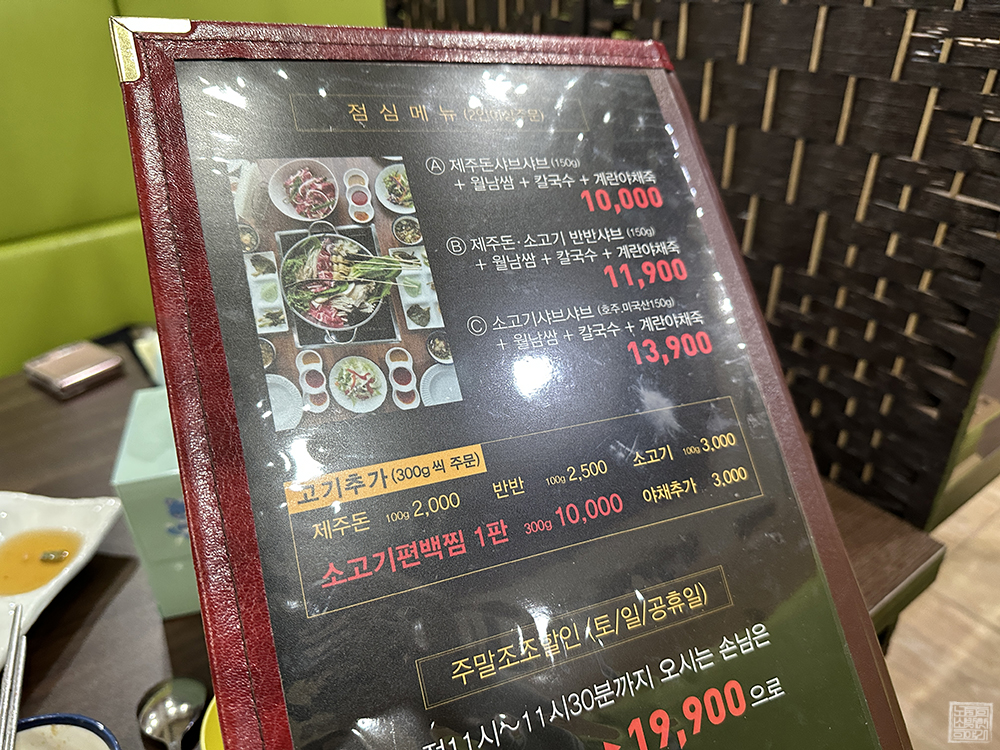 소고기 편백찜 샤브를 기준으로 평일 점심 1인분 19,900원이고, 평일 저녁과 주말·공휴일은 1인분 24,900원에 판매되고 있다. '샤브샤브'가 아니라 김치찌개나 되재국밥이라면 거의 2인분에 해당하는 가격이 1인분 가격이기 때문에 분명히 부담되는 가격이다. 하지만 '편백찜'이 무한 리필이라는 걸 고려한다면 나쁘지 않다고 생각한다.