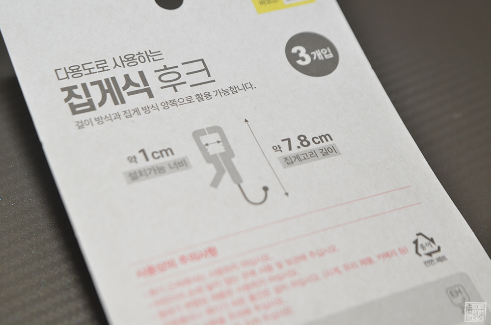 처음에는 지금 씽크대에 해둔 것과 마찬가지로 빨래집게를 추가로 구매해서 사용하는 걸 생각했었는데, 다이소에서 '다용도로 사용하는 집게식 후크'를 본 이후 딱 이거다 싶었다. 걸이 방식과 집게 방식 양쪽으로 활용이 가능한 집게식 후크는 씽크대에서 수세미를 말리는 용도만 아니라 다양한 방면에서도 충분히 활용할 수 있어 보였다.