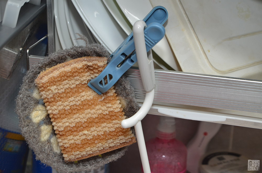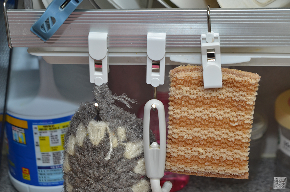 보통 수세미는 여러 가지를 한꺼번에 걸어두는 건 좋지 않다고 한다. 세 개의 수세미(하얀 손잡이는 컵이나 물병을 씻는 용도로 사용한다)는 평범하게 그릇을 씻는 용도와 냄비를 씻는 용도, 그리고 컵을 씻는 용도로 구분해서 사용하고 있다. 하지만 싱크대에 이것들을 개별적으로 걸어둘 장소가 마땅히 없어 위 사진처럼 놓아두고 있었다.
