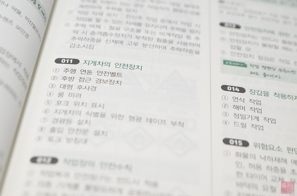 나는 자동차 운전 면허 필기시험과 마찬가지로 평범한 상식을 갖추고 있으면 누구나 쉽게 붙을 수 있는 시험이라고 생각했다. 하지만 책에서 볼 수 있는 필기시험에 필요한 여러 지식을 본다면 그냥 상식 수준이 아니라 전문적인 수준의 지식을 필요로 했다. 위험한 산업 현장에서 지게차 운전을 하는 일이다 보니 알아둬야 하는 게 많았다.
