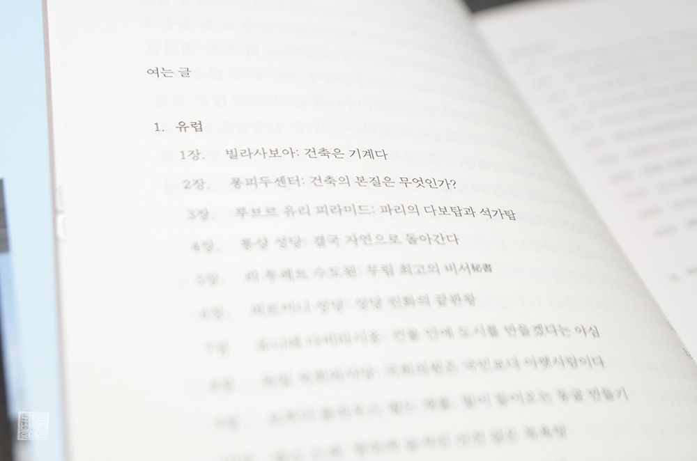 그랬었는데 이번에 중고서점을 둘러보다 <유현준의 인문 건축 기행>을 본 이후 잠깐 망설이다가 책을 중고로 구매해서 읽어보기로 했다. 책은 무려 485페이지로 구성되어 있을 정도로 분량이 방대했고, 카테고리는 크게 유럽과 북아메리카와 아시아 세 개로 나누어서 나라별로 흥미로운 건축가와 건축물을 소개하고 있다.