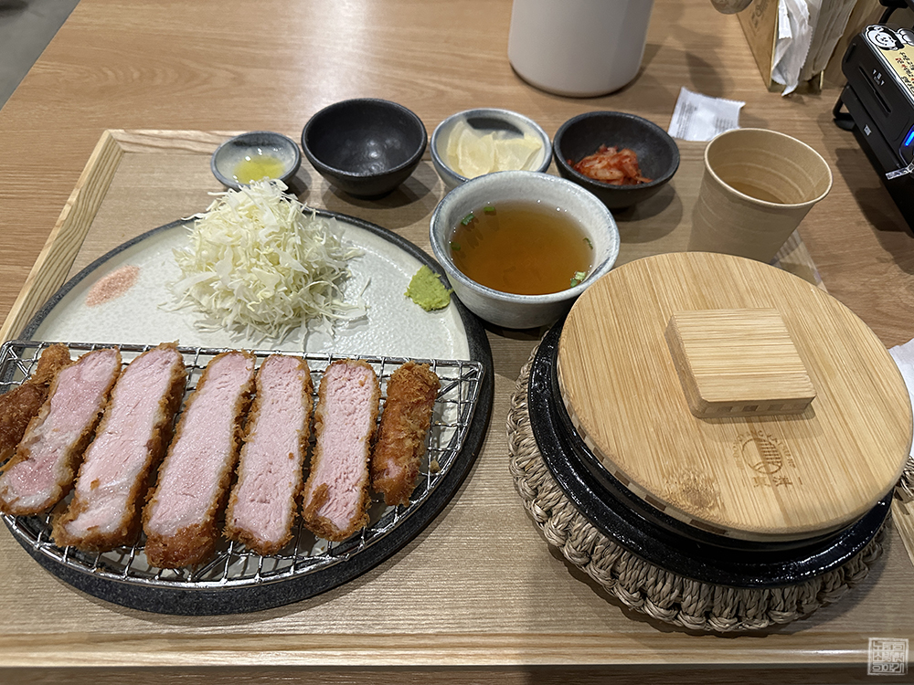 등심 카츠를 주문하고 천천히 가게를 둘러보고 기다리다 보니 마침내 주문한 등심 카츠가 나왔다. 등심 카츠를 메인으로 몇 가지 반찬과 함께 기름장(트러플 오일), 와사비, 핑크 소금, 김치, 단무지 등이 골고루 구성되어 있었다. 여기까지는 평범한 돈가스 전문점과 다를 게 없지만, 다른 점이 있다고 한다면 밥이 솥밥이었다는 점이다.