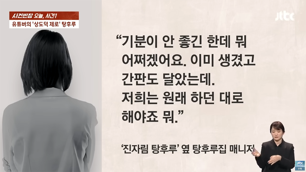 JTBC <사건반장>의 양원보 앵커의 말대로 탕후루 가게가 전혀 없는 곳에서 자신의 꿈 중 하나이자 도전해보고 싶은 과제 중 하나로 탕후루 가게를 열었다면 아무런 문제가 되지 않았을 것이다. 하지만 그녀는 하필이면 탕후루 가게가 있는 곳의 옆건물도 아니라 같은 건물에서 옆 호실에 거짓말로 탕후루 가게를 열면서 비난을 받게 되었다.