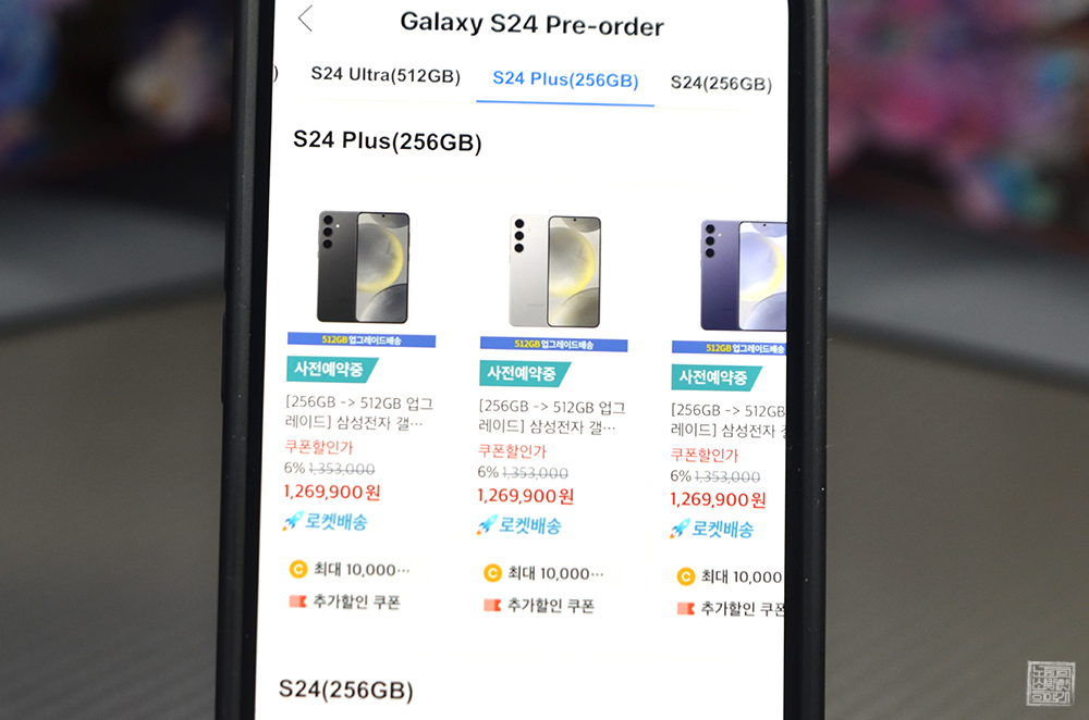 아래에 첨부한 사진을 통해 쿠팡에서 제공하는 사전 예약 6% 할인 쿠폰을 적용한 갤럭시 S24 시리즈 256GB 모델 가격을 살펴보자.