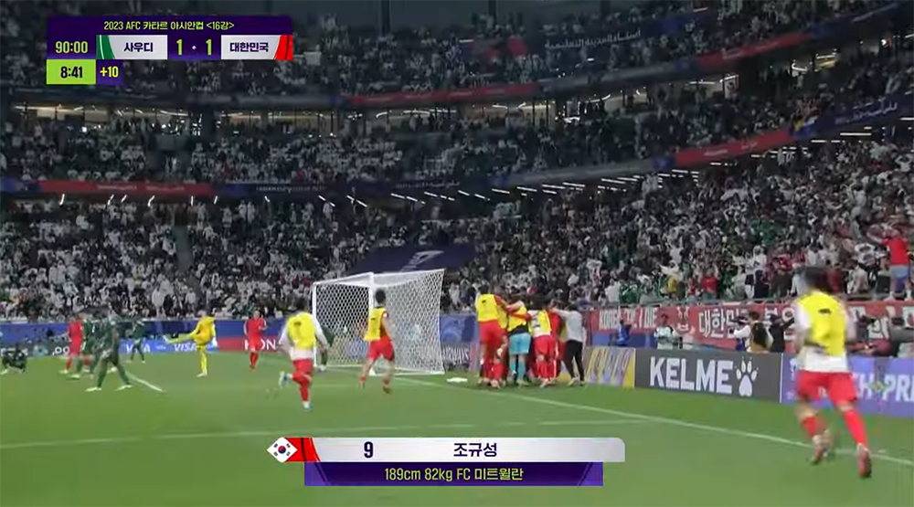 하지만 승부는 끝날 때까지 끝난 게 아니라는 말이 있듯이 후반에 주어진 추가 시간 10분 동안에도 한국은 사우디가 정신이 없을 정도로 맹공을 퍼부었다. 문을 계속 두드리다 보면 결국에는 열린다는 말이 있듯이, 한국은 후반 추가 시간 9분이 가까워졌을 때 설영우의 크로스를 받은 조규성이 극적인 헤딩골로 동점을 만들었다.