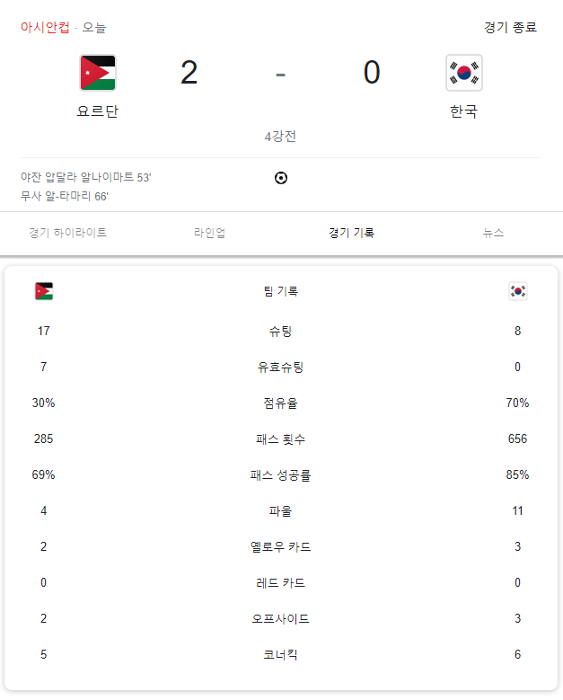 그렇게 한국은 90분+13분(추가 시간) 동안 요르단에게 속수무책으로 무너지면서 유효슈팅 0개로 공격을 좀처럼 풀어나가지 못하면서 2:0으로 패배하고 말았다. 흔히 이 정도의 경기 결과는 정말 강한 상대를 만났을 때 나오는 결과이다 보니 해설진과 경기를 지켜본 팬들은 할 말을 잃고 말았다. 어떻게 이 정도까지 무너질 수가 있었을까?