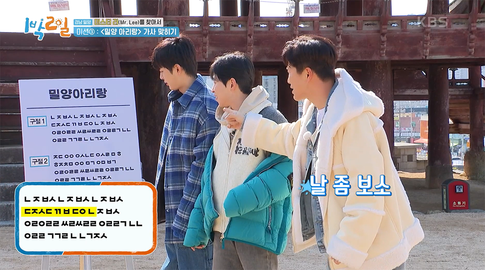 "날 좀 보소! 날 좀 보소!"로 시작하는 1절 가사는 많은 사람에게 익숙하지만, 2절과 3절은 정말 아는 사람만 알다 보니 멤버들이 열심히 주변 사람들에게 도움을 청하는 모습을 재미있게 볼 수 있었다. 밀양 영남루가 있는 곳은 단순히 그곳에서 바라보는 풍경만 아니라 주변 산책로가 잘 갖춰져 있기 때문에 가볍게 걷기에도 좋은 곳이었다.