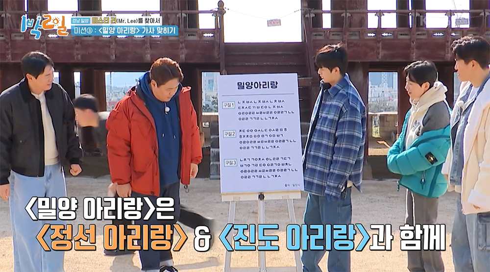 <1박 2일> 멤버들은 달빛 쌈지 공원에서 미션을 소화한 이후 다음으로 국보로 지정된 목조 건물이 있는 영남루를 찾아 밀양 풍경을 내려다보고, 밀양 아리랑 가사를 맞추는 미션을 소화했다. 밀양 아리랑은 정선 아리랑과 진도 아리랑과 함께 한국의 3대 아리랑 중 하나로, 밀양 향교에서는 밀양 아리랑을 부르는 공연이 이루어지기도 한다.