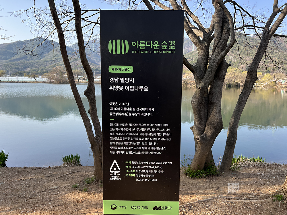 밀양 위양지는 아름다운 숲 전국 대회에서 제16회 공존상을 수상한 곳이기도 하다. 위양지의 '위양'이란 양민을 위한다는 뜻으로, 임금이 백성을 위해 쌓은 저수지 주변에 소나무, 이팝나무, 팽나무, 느티나무 등을 심었다고 전해지는 곳이라는 것을 당시 위양지에 세워진 푯말을 통해 알 수 있었다. 오랜 시간 동안 역사를 축적한 곳인 셈이다.