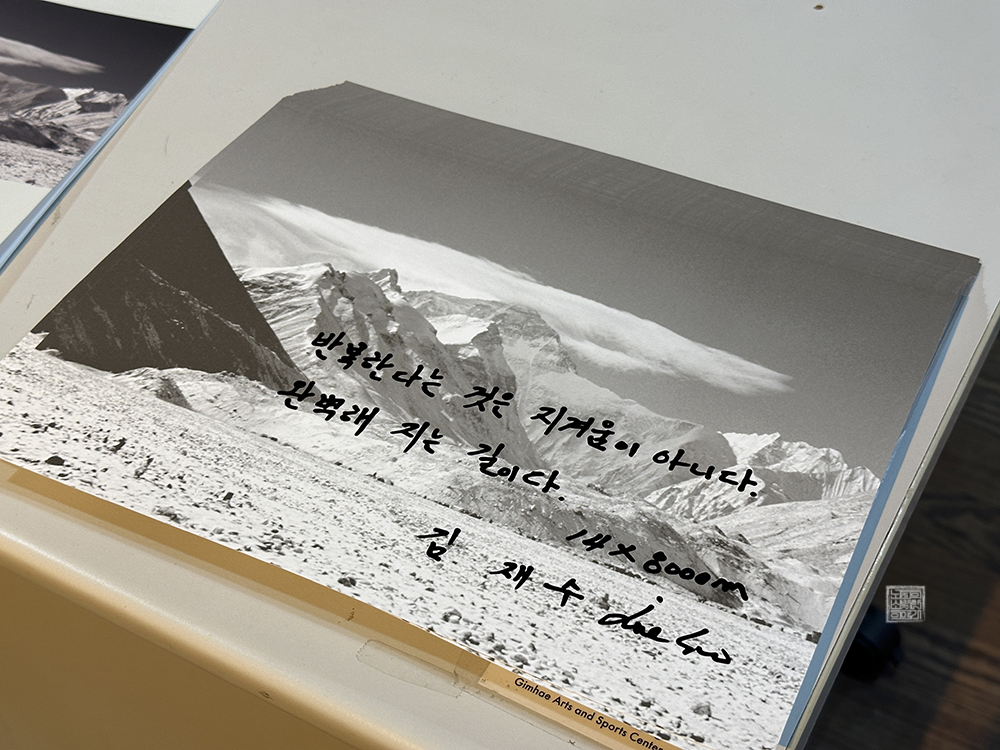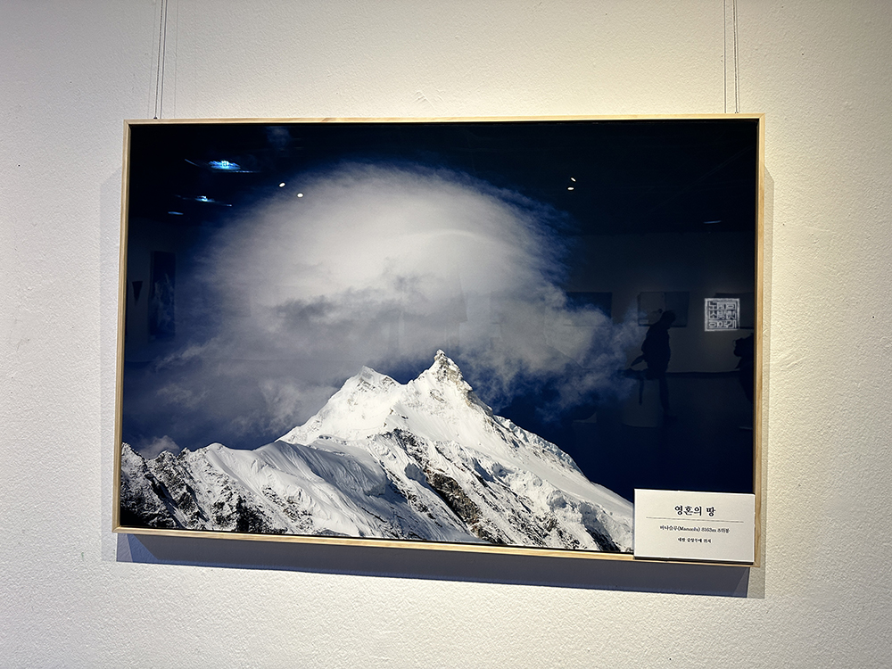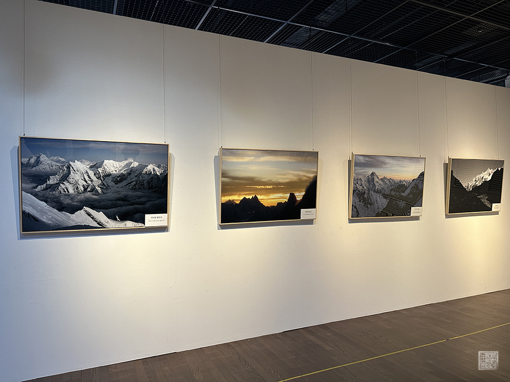 전시회가 열리는 김해 문화의 전당 윤슬미술관 제1전시실로 간다면 벽을 둘러 싼 히말라야의 모습을 볼 수 있다. 눈이 좀처럼 내리지 않는 김해에서는 보기 어려운 설산이기도 하고, 하얗게 눈이 덮인 히말라야의 모습은 깊이 감탄할 수 있는 위용을 자랑했다. 사진이 목적은 아니었겠지만… 저기를 도대체 어떻게 올라갈 수 있었던 걸까?