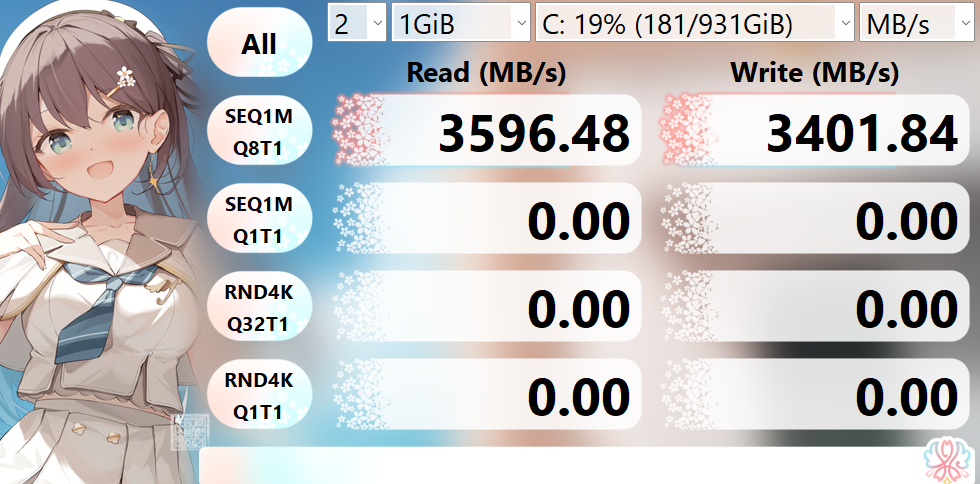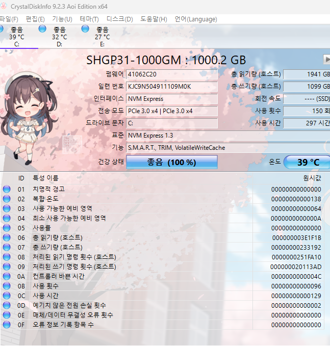 새 제품을 사용하고 겨우 한두 달 정도가 경과했다 보니 온도도 준수했고, 상태는 당연히 '건강함'으로 떠 있었다. 속도 테스트를 진행했을 경우에도 귀찮아서 일부러 한 차례만 테스트를 했는데… 읽기와 쓰기 속도 모두 준수했다. 요즘 사람들은 컴퓨터의 저장 장치는 이전과 같은 디스크 방식보다 반도체를 이용한 SSD를 선호하는 편이다.